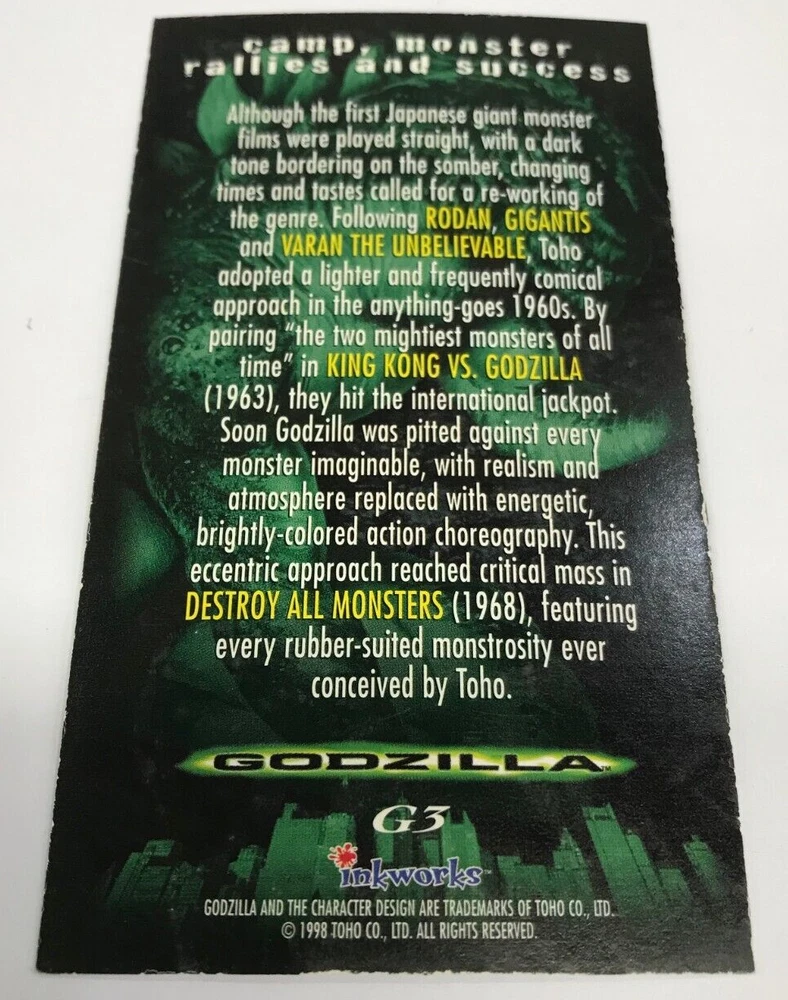 Inkworks Godzilla Widevision Movie Trading Card Glow In Dark 6-Puzzle Chase G3 (1 card) This card set is widevision card size. They are about 11.4 cm high x 6.3 cm wide. You are purchasing 1 CHASE CARD only. Combined postage + handling policy: Domestic: after first highest postage, $1 for each additional card or Base Team Set, $3 for each additional chase card set, $5 for each additional base set or album; International: after first highest postage, $3 for each additional card or Base Team set, $6 for each additional chase card set, $11 for each additional base set; We will automatically refund the extra you paid when we process the order.