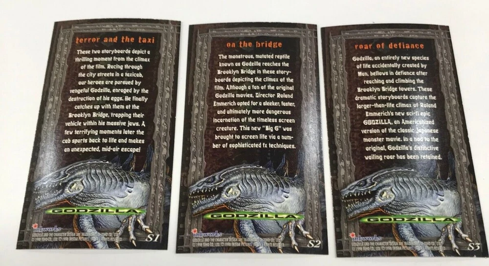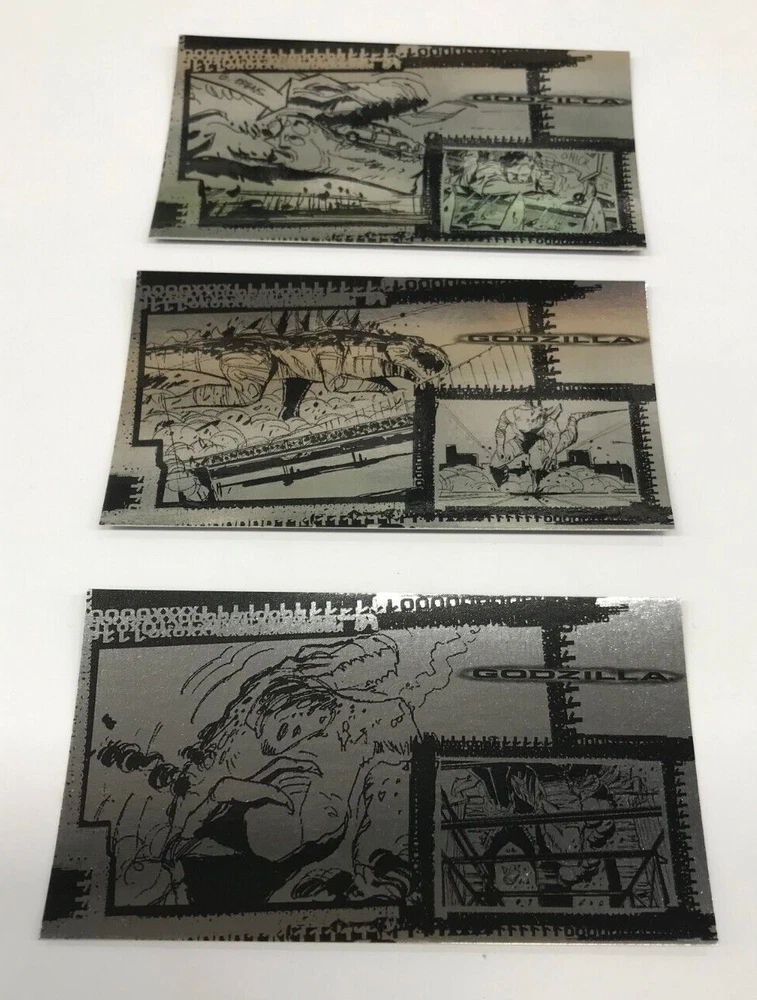Inkworks Godzilla Widevision Movie Trading Card Silverzilla Chase Card Full Set This card set is widevision card size. They are about 11.4 cm high x 6.3 cm wide. You are purchasing 1 SET OF 3 CHASE CARDS only. Combined postage + handling policy: Domestic: after first highest postage, $1 for each additional card or Base Team Set, $3 for each additional chase card set, $5 for each additional base set or album; International: after first highest postage, $3 for each additional card or Base Team set, $6 for each additional chase card set, $11 for each additional base set; We will automatically refund the extra you paid when we process the order.