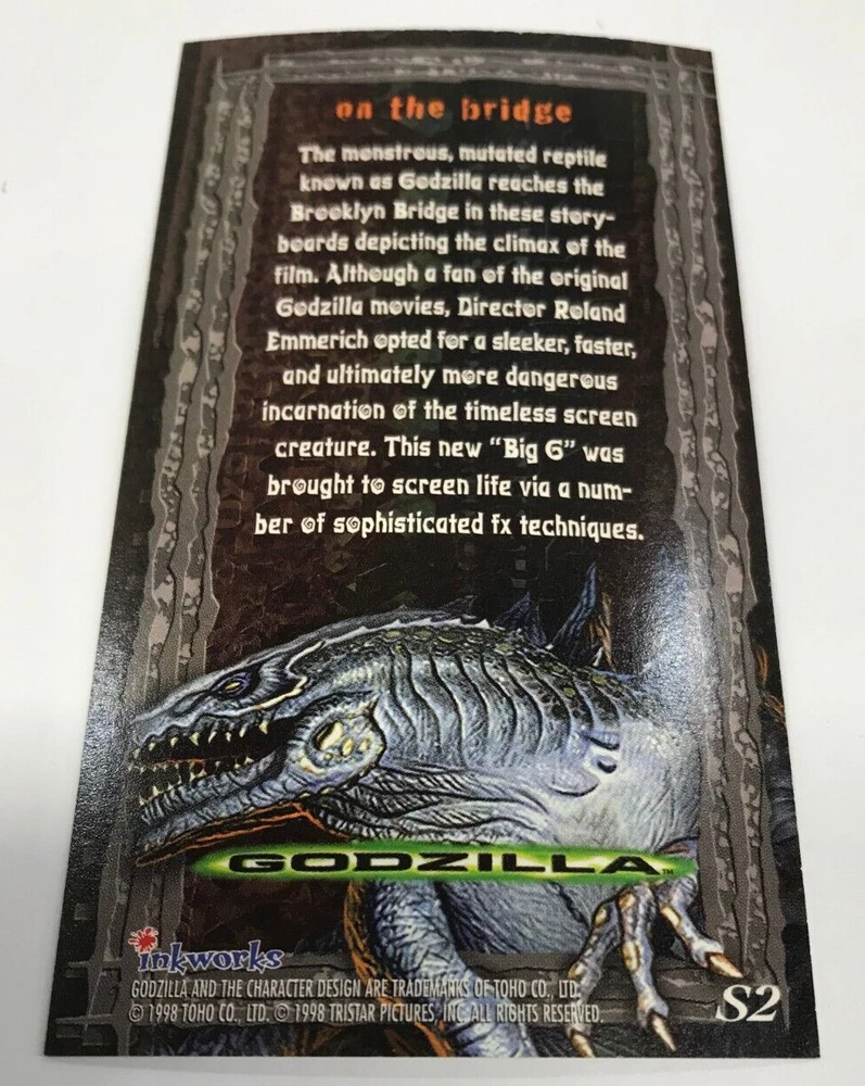 Inkworks Godzilla Widevision Movie Trading Card Silverzilla Chase Card S-2 ( 1 card ) This card set is widevision card size. They are about 11.4 cm high x 6.3 cm wide. You are purchasing 1 CHASE CARD only. Combined postage + handling policy: Domestic: after first highest postage, $1 for each additional card or Base Team Set, $3 for each additional chase card set, $5 for each additional base set or album; International: after first highest postage, $3 for each additional card or Base Team set, $6 for each additional chase card set, $11 for each additional base set; We will automatically refund the extra you paid when we process the order.