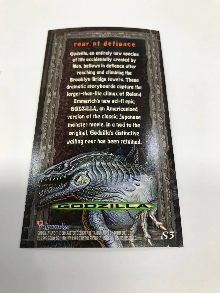 Inkworks Godzilla Widevision Movie Trading Card Silverzilla Chase Card S-3 ( 1 card ) This card set is widevision card size. They are about 11.4 cm high x 6.3 cm wide. You are purchasing 1 CHASE CARD only. Combined postage + handling policy: Domestic: after first highest postage, $1 for each additional card or Base Team Set, $3 for each additional chase card set, $5 for each additional base set or album; International: after first highest postage, $3 for each additional card or Base Team set, $6 for each additional chase card set, $11 for each additional base set; We will automatically refund the extra you paid when we process the order.
