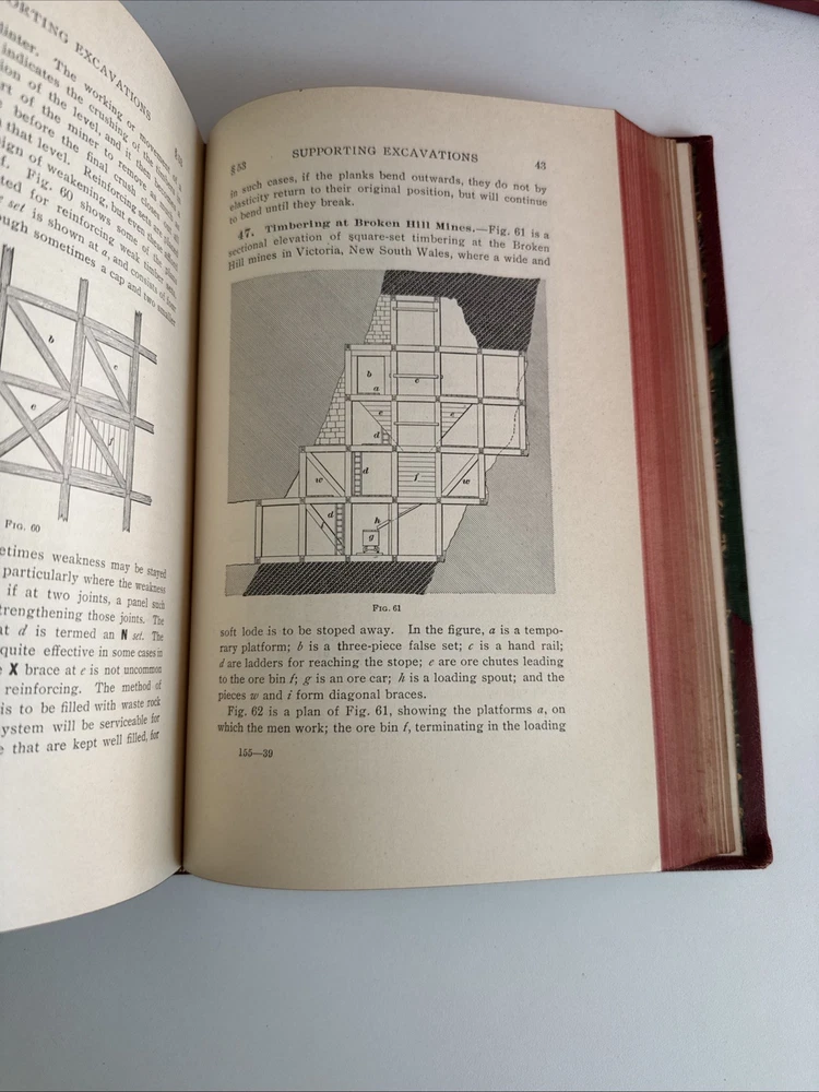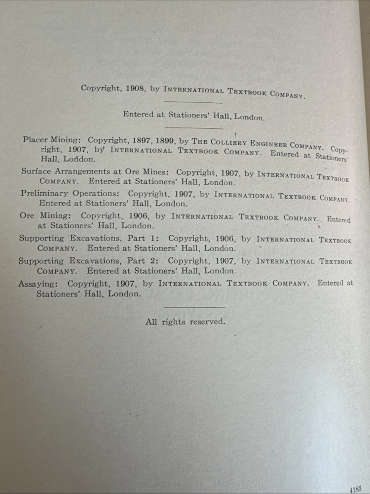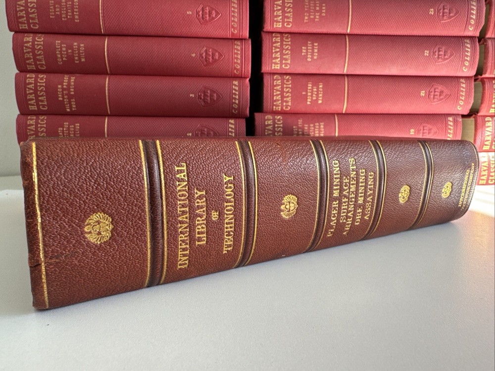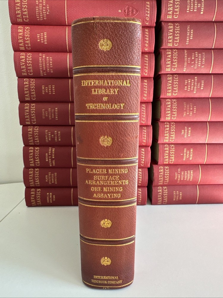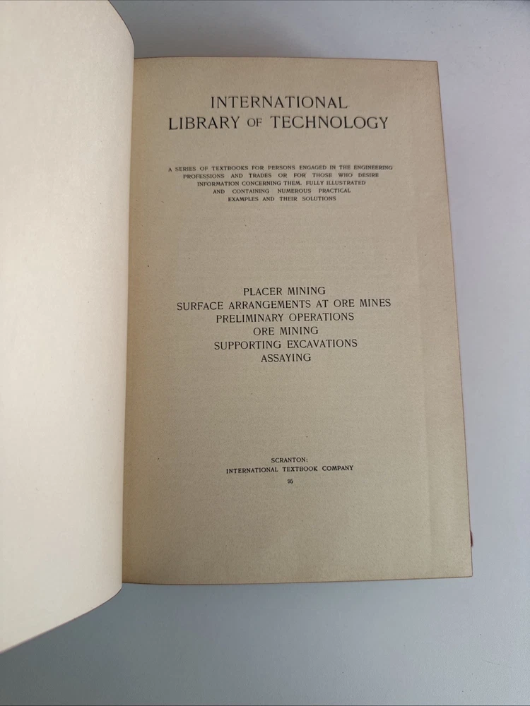 International Library of Technology: Placer Mining, Surface Arrangements, Ore Mining, Assaying Published in 1908 by International Textbook Company. Deluxe edition bound in 3/4 leather. Marble end pages. In good to very good condition overall. Some general, minor shelf and age wear. Mild age tanning to pages. Binding remains very crisp. Shipped for FREE!