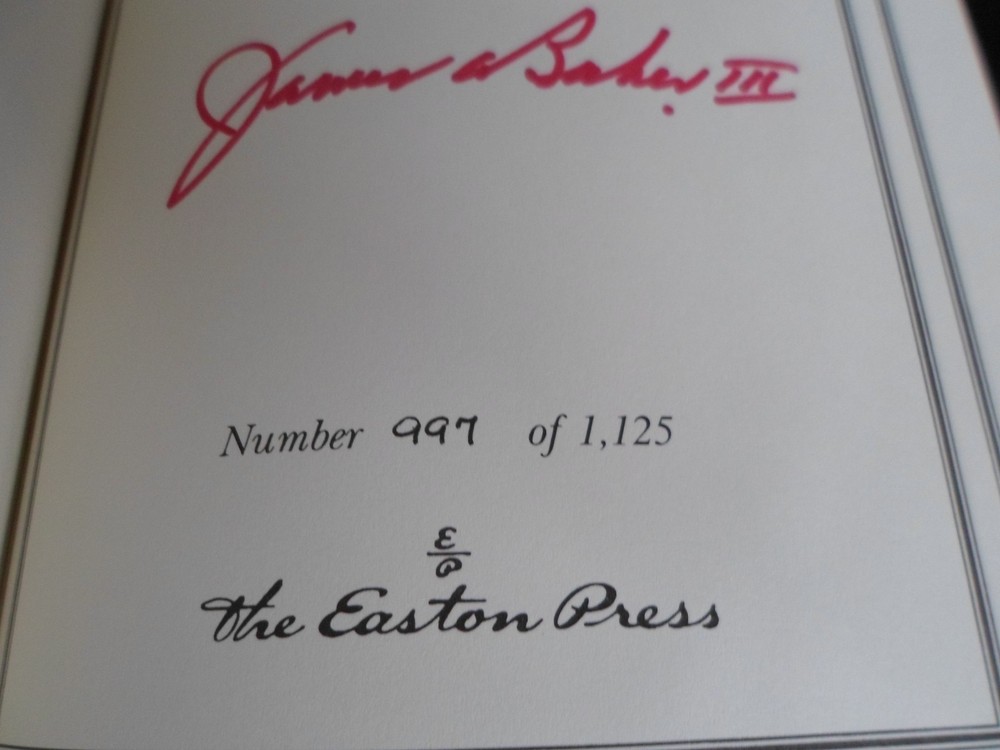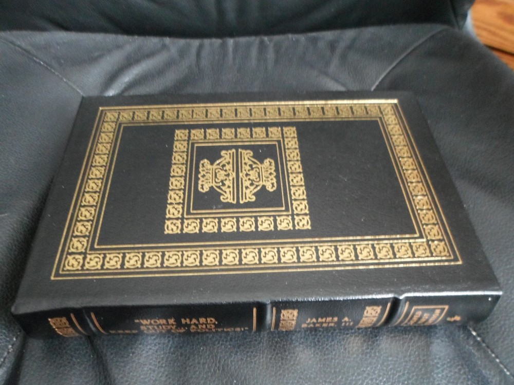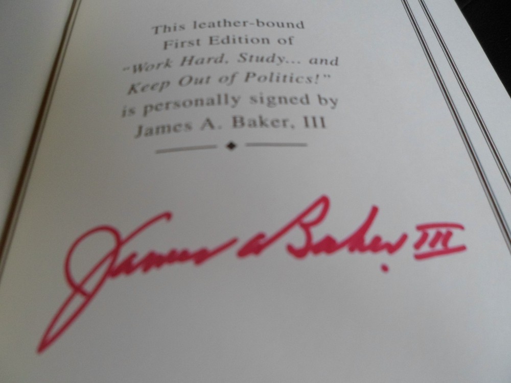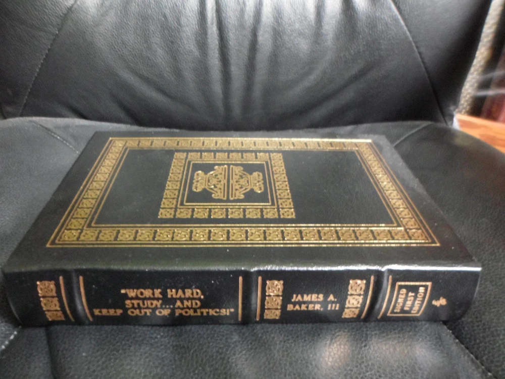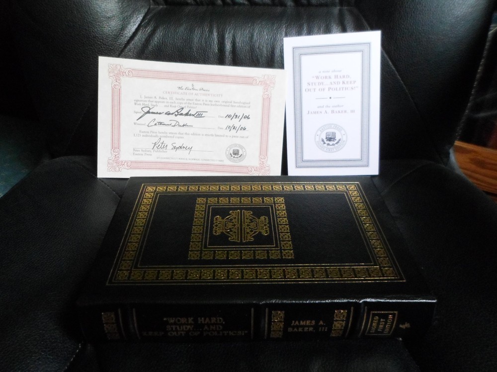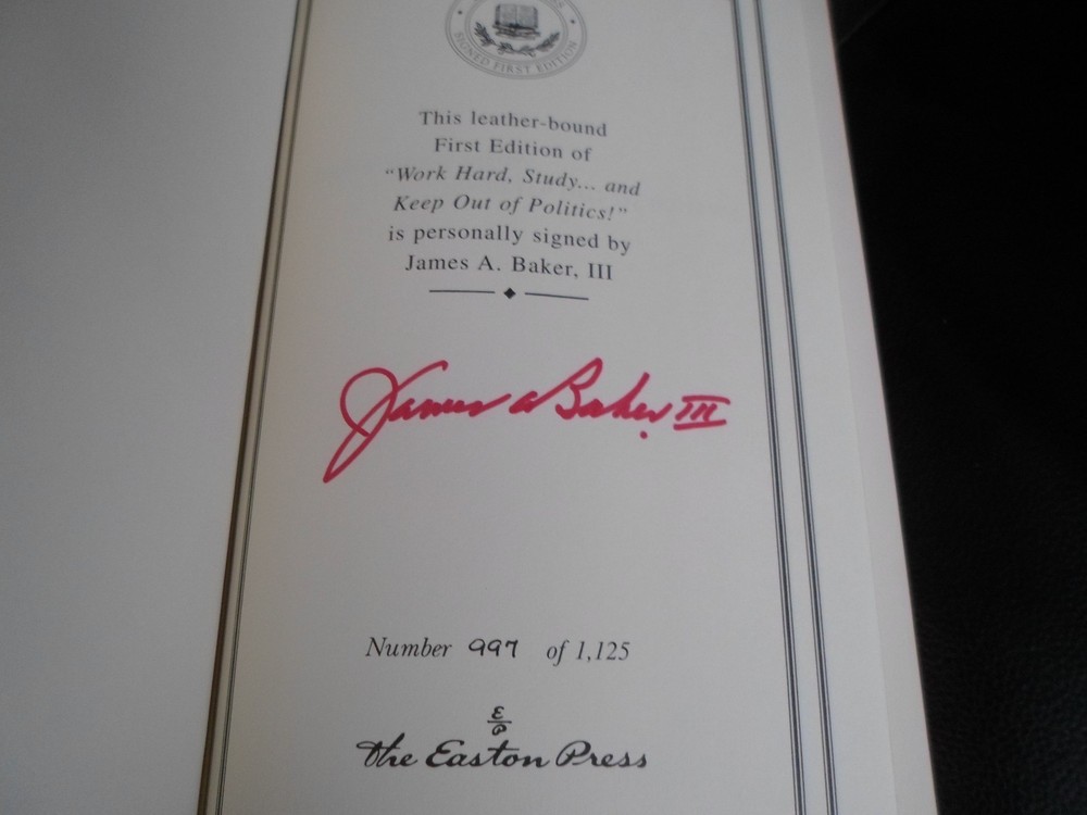 This is a leather bound signed first edition of former Secretary of State James A. Baker III's best-selling memoir - "Work Hard, Study ... and Keep Out of Politics!" . The book is unread and in great condition, and there are no signs of previous ownership. Signed by the author on the limitation page, this is copy number 997 of 1125 ever published. The book includes the signed and dated certificate of authenticity and the publisher's note card. Easton Press books are the golden standard in the publishing industry, highly collectible and lasting generations. Easton Press Full Genuine Leather Hubbed Spine Accented Wit 22 kt. Real Gold Satin Ribbon Page Marker Distinctive Cover Design Gilded Page Edges To Protect Against Humidity High Quality Acid - Free paper Smyth-Sewn Pages Silk-Moire Endleaves I combine multiple items for savings on shipping charges. I ship worldwide. Please ask about international shipping charges and/or different shipping options.Thank you!