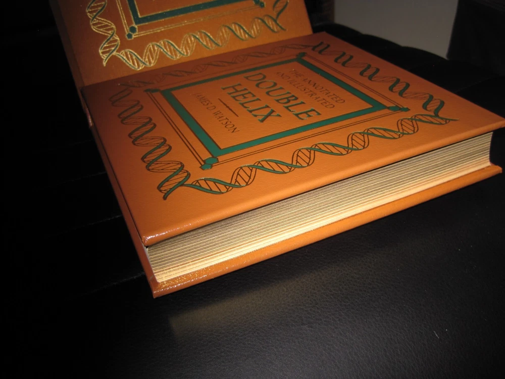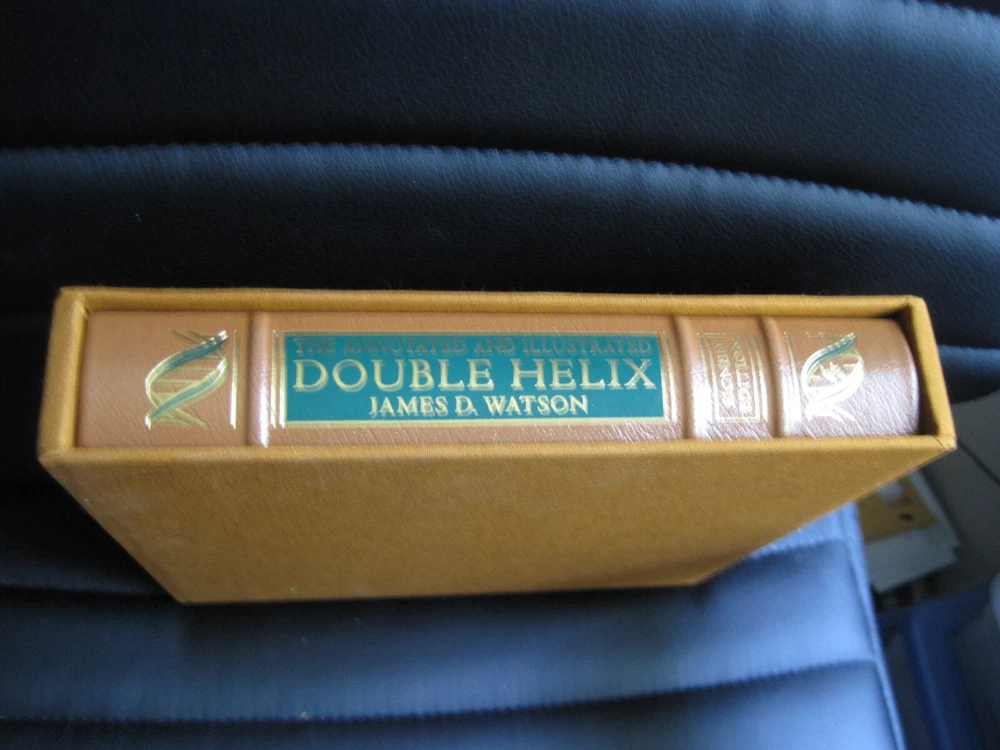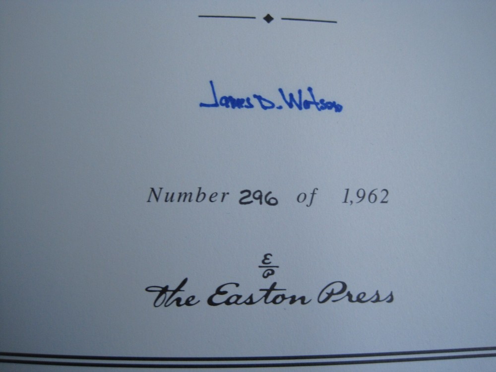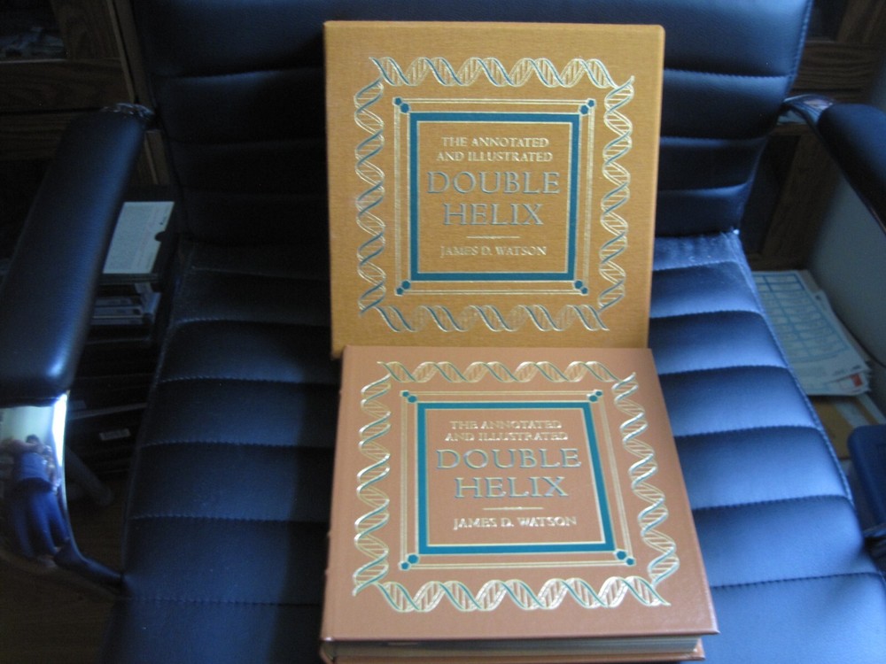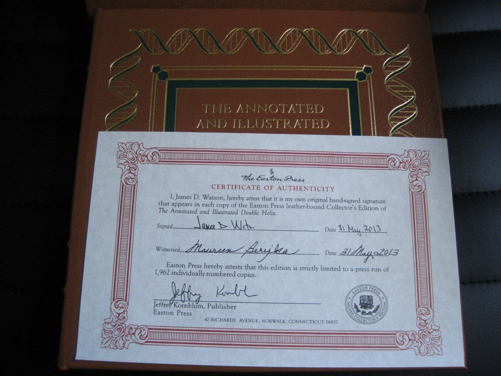 Up for auction is a brand new signed and numbered luxury edition of James D. Watson 's best-selling memoir: "The Annotated and Illustrated Double Helix" , the fascinating story of the discovery of the DNA structure, arguably the most important scientific breakthrough in biology in the 20th Century. This magnificent book is signed by the Nobel Prize winning scientist and co-discoverer of the DNA structure and genetic code. The book is unread and in great condition. It includes the certificate of authenticity, signed and dated by the author, and it has a beautiful matching slipcase. This is book number 296 of only 1962 copies of this edition ever printed. Dr. Watson's acclaimed memoir is a wonderful chronicling of the dramatic race to identify the structure of DNA. This new annotated and illustrated volume provides an extraordinary assortment of documents and photographs -- many never before published -- that add depth and context to Watson's legendary discovery. Easton Press books are the golden standard in the publishing industry, highly collectible and lasting generations. Easton Press Full Genuine Leather Dubbed Spine Accented With 22 kt. Real Gold Satin Ribbon Page Marker Distinctive Cover Design Gilded Page Edges To Protect Against Humidity High Quality Acid - Free paper Smyth-Sewn Pages Silk-Moire Endleaves
