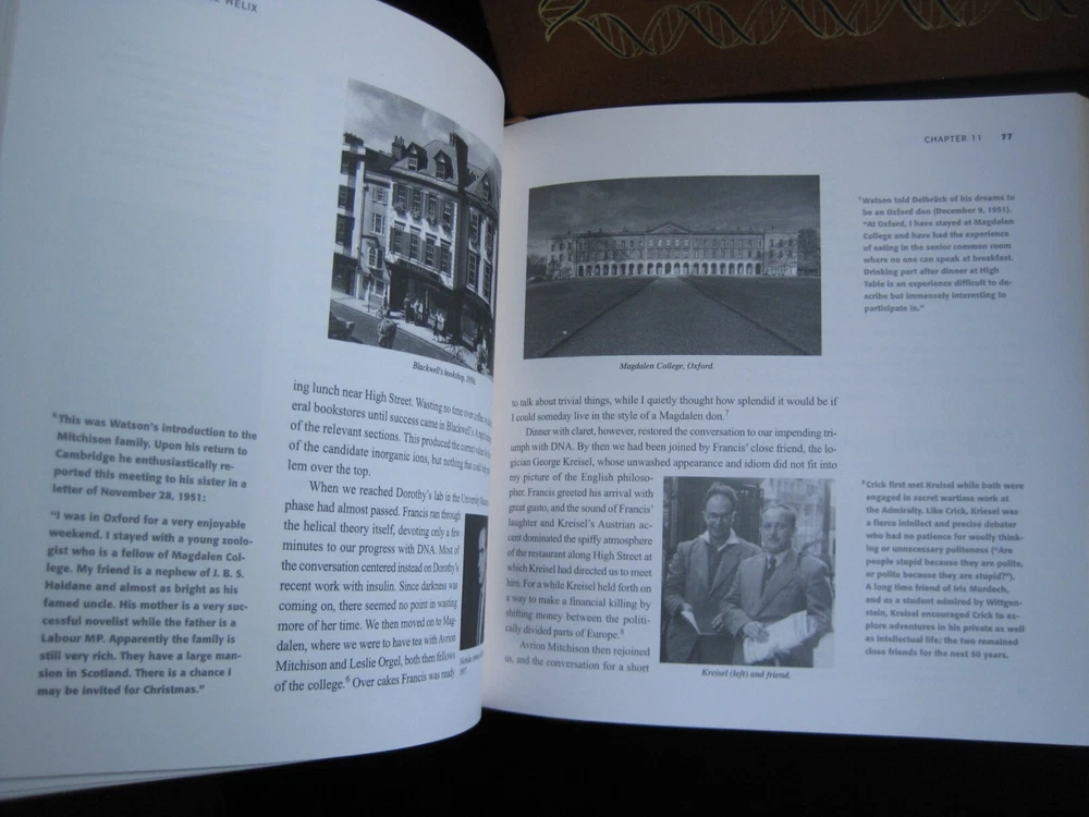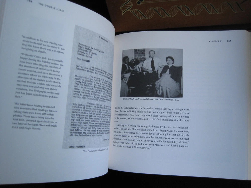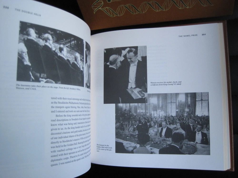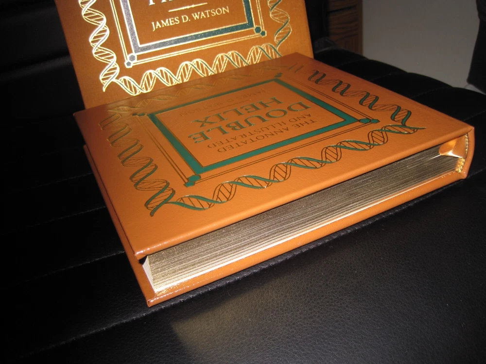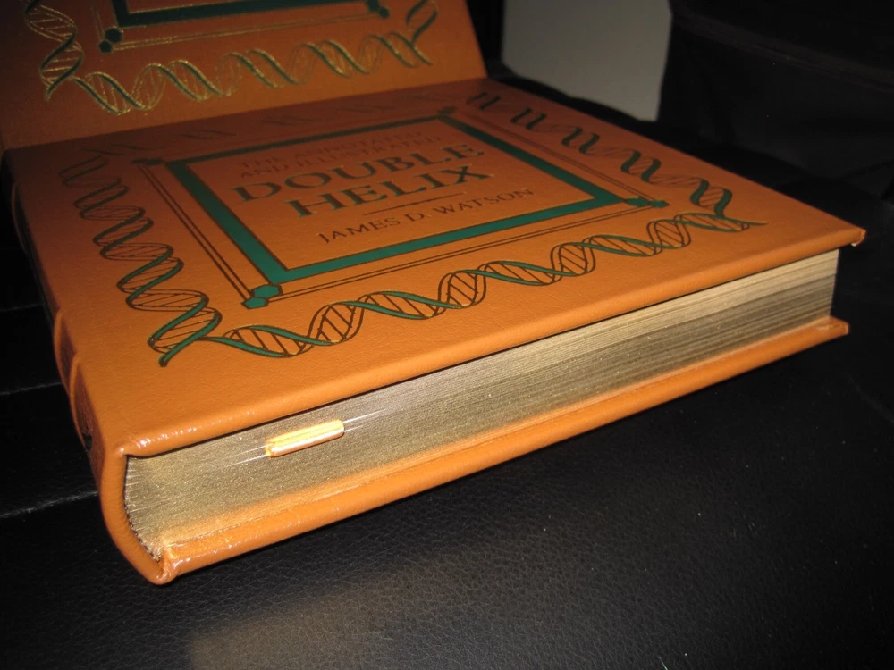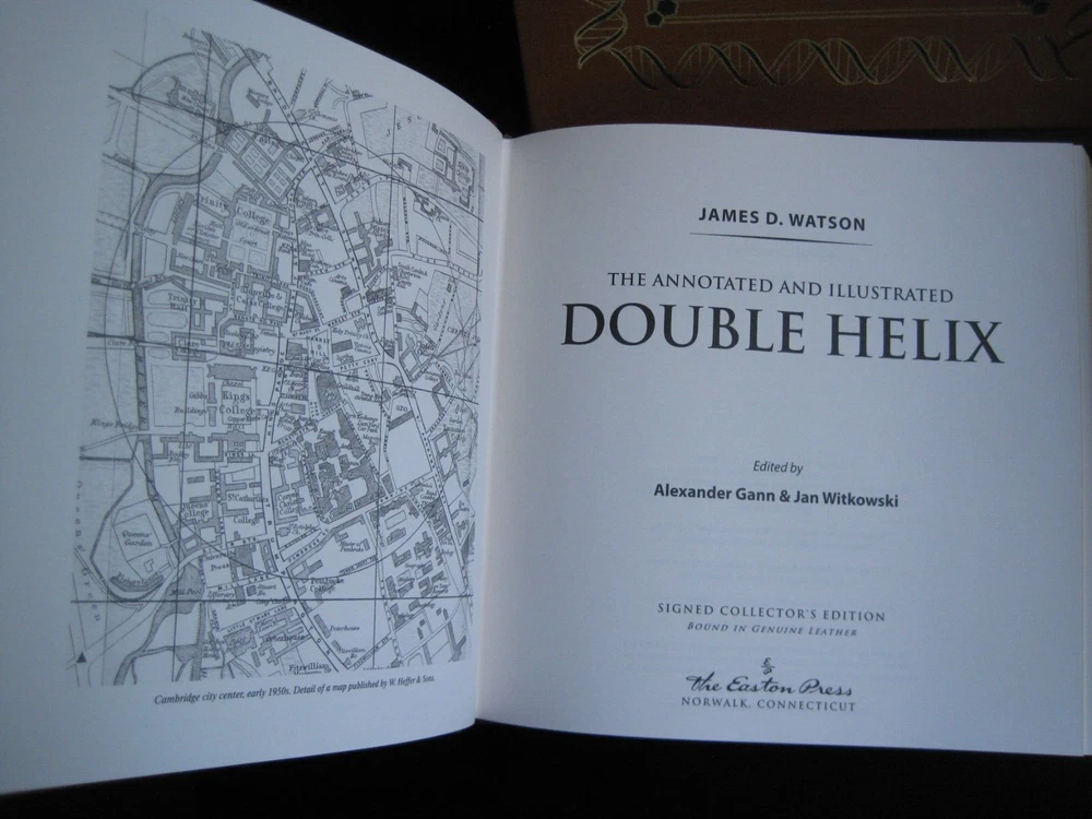 Up for auction is a brand new signed and numbered luxury edition of James D. Watson 's best-selling memoir: "The Annotated and Illustrated Double Helix" , the fascinating story of the discovery of the DNA structure, arguably the most important scientific breakthrough in biology in the 20th Century. This magnificent book is signed by the Nobel Prize winning scientist and co-discoverer of the DNA structure and genetic code. The book is unread and in great condition. It includes the certificate of authenticity, signed and dated by the author, and it has a beautiful matching slipcase. This is book number 296 of only 1962 copies of this edition ever printed. Dr. Watson's acclaimed memoir is a wonderful chronicling of the dramatic race to identify the structure of DNA. This new annotated and illustrated volume provides an extraordinary assortment of documents and photographs -- many never before published -- that add depth and context to Watson's legendary discovery. Easton Press books are the golden standard in the publishing industry, highly collectible and lasting generations. Easton Press Full Genuine Leather Dubbed Spine Accented With 22 kt. Real Gold Satin Ribbon Page Marker Distinctive Cover Design Gilded Page Edges To Protect Against Humidity High Quality Acid - Free paper Smyth-Sewn Pages Silk-Moire Endleaves