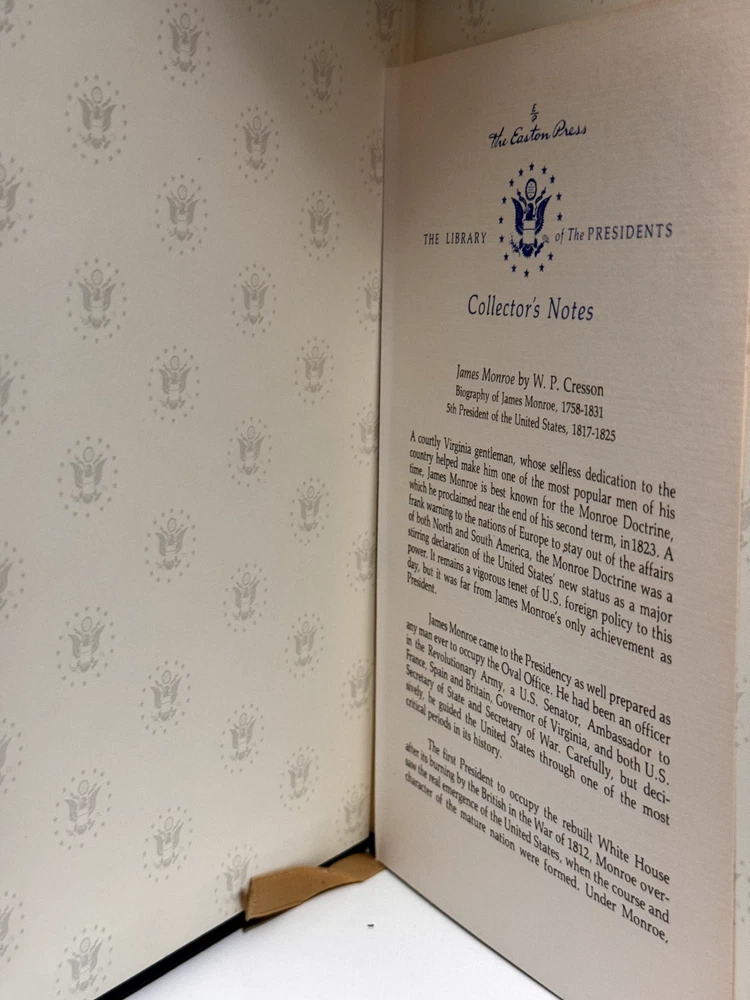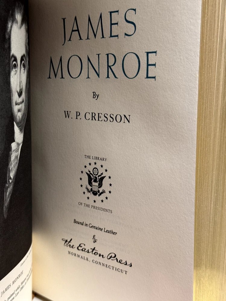 You are bidding on a very fine copy of a 1st Edition, 1st Printing of the Easton Press' THE LIBRARY OF THE PRESIDENTS series edition of W. P. Cresson's JAMES MONROE. This is a one-volume edition about the life and work of the 5th President of The United States, James Monroe. Bound in beautiful genuine moroccan cowhide leather, the book features raised bars on the spine, gold tooling on the cover and spine, End-pages decorated with the seals of the U.S. Presidents, satin silk sewn-in bookmark, 22k gold dust on page ends on all 3 sides. Printed on archival quality acid-neutral paper, that will last for generations without diminishing in quality or looks. LIMITED, COLLECTOR'S EDITION FROM THE SERIES OF THE LIBRARY OF THE PRESIDENTS. Free Shipping in all of Continental United States. All other buyers, please check with me for shipping rates before bidding. See my other listings. I have a large collection of rare and collectible books, most leather-bound, others of first edition, first printing, even unpublished manuscripts. I will combine them during shipping so you can receive them together. Just message me your intent to buy more than one book, and I will hold them to be shipped together. Happy Buying!