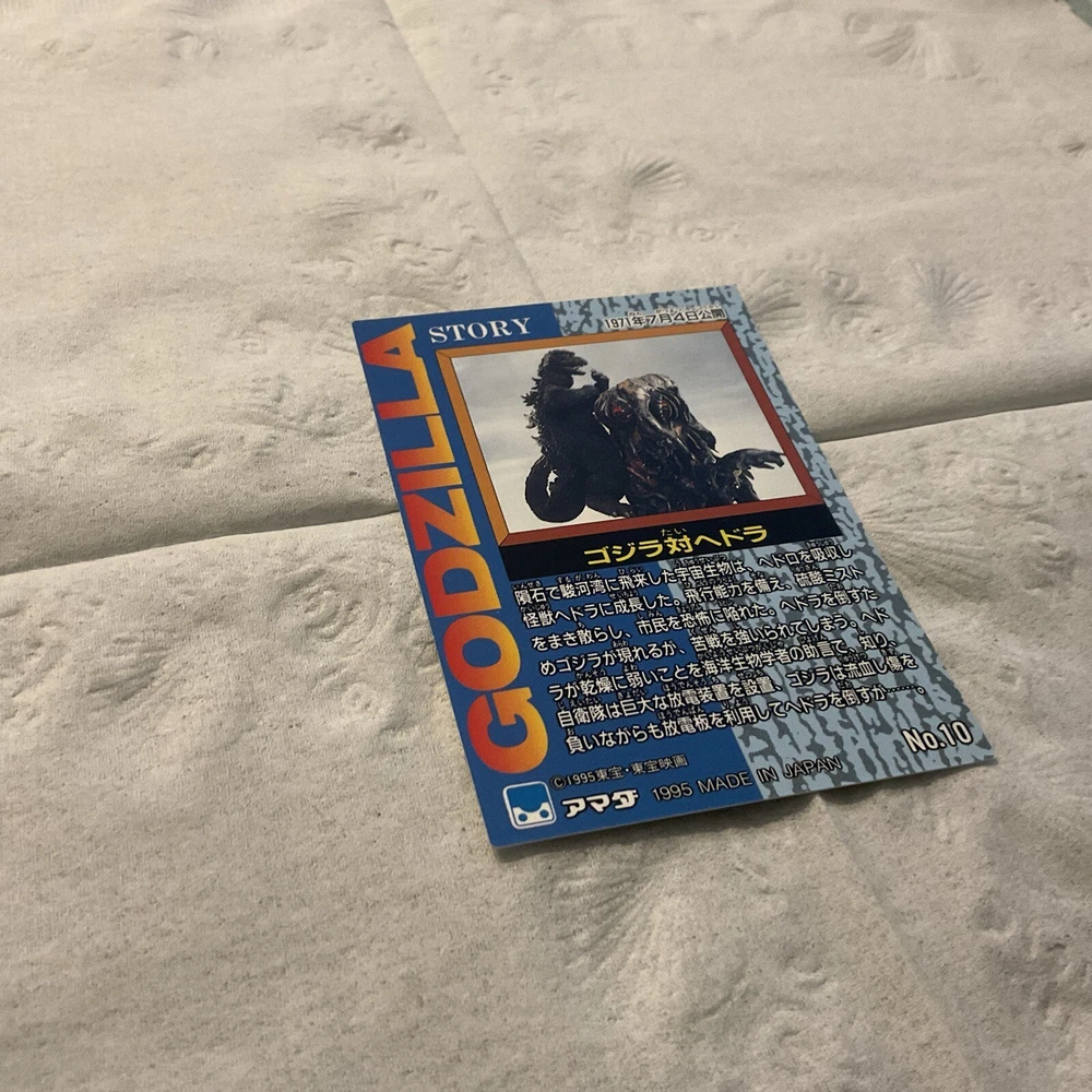 For sale is a rare and highly collectible Godzilla trading card from Japan's 1995 Trading Collection. This original non-sport trading card features the iconic kaiju on a card stock material with Japanese text. The card is in very good condition and is a standard size. It is part of the "Base Trading Card" series and is card number 10. This item is perfect for any Godzilla or trading card collector and would make a great addition to any collection.
