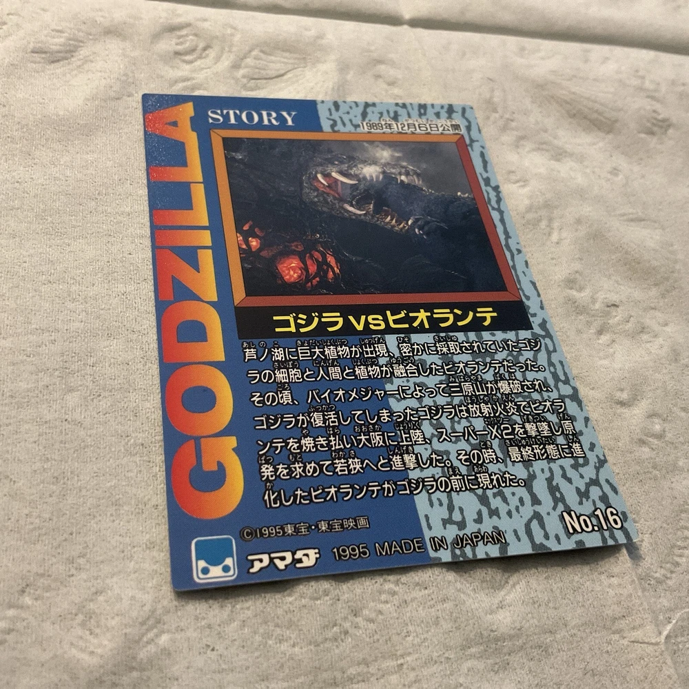 This Japanese non-sport trading card features the iconic kaiju, Godzilla, from the 1995 Trading Collection set by JPP Amada. The card is made from high-quality card stock and has a standard size for easy collection. It is an original card, not a licensed reprint, and is perfect for any Godzilla fan or collector. The card is in very good condition and depicts Godzilla in all its glory. It is not autographed but is a great addition to any collection. With a year of manufacture in 1995, it is a vintage piece and a must-have for any serious collector.