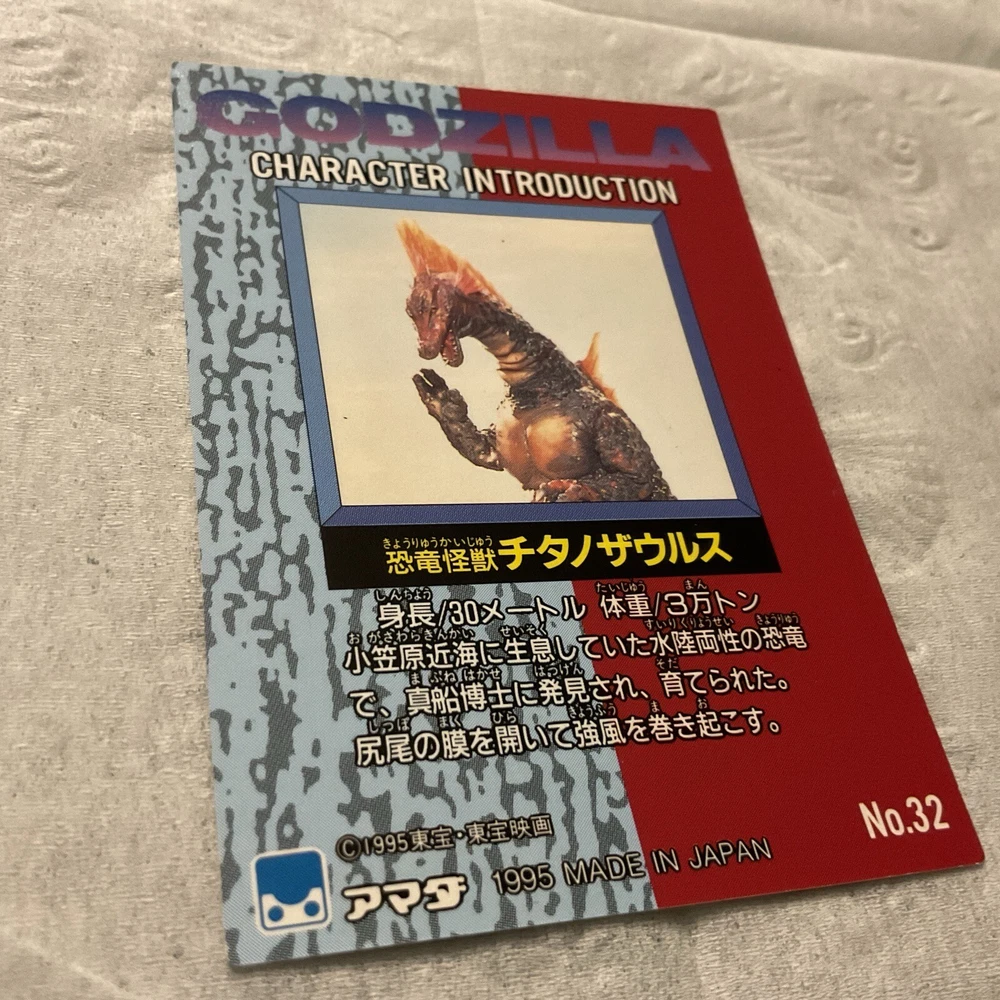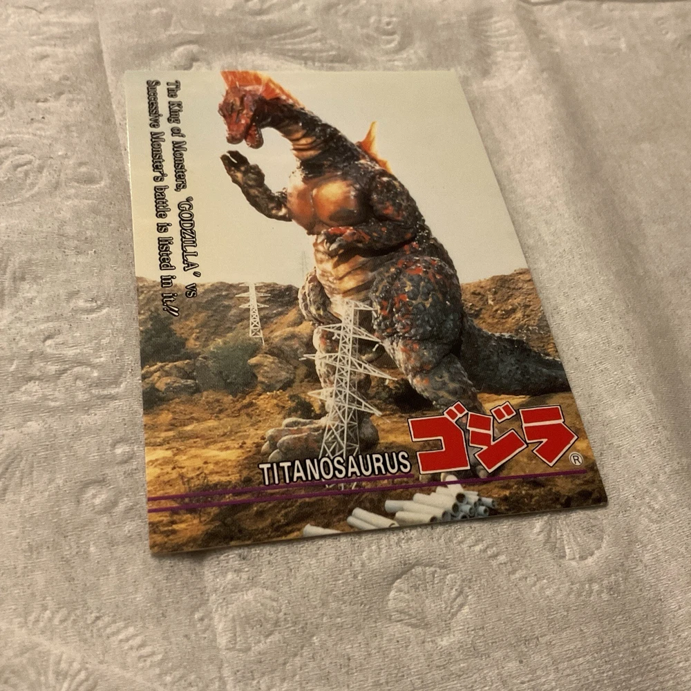Up for sale is a rare Japanese non-sport trading card from the 1995 Godzilla: Trading Collection by JPP Amada. This base trading card features card stock material with very good condition, depicting a kaiju from the Godzilla franchise. The card is standard size and measures in at 2.5 x 3.5 inches, and is an original licensed reprint released only in Japan. The card is not autographed and falls under the Collectibles and Non-Sport Trading Cards categories. It is one of many trading card singles available from this set, which includes various monsters from the Godzilla universe. Don't miss your chance to own a piece of Kaiju history!