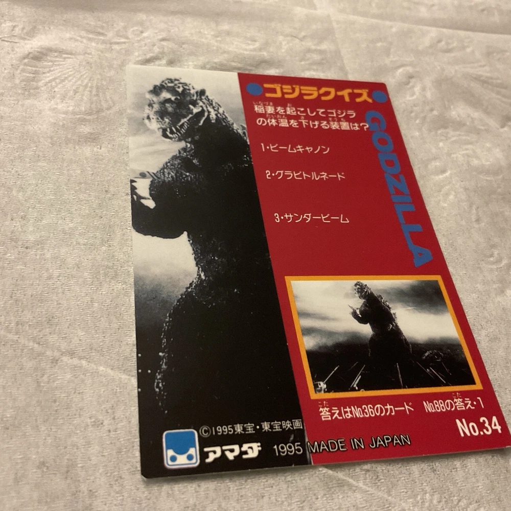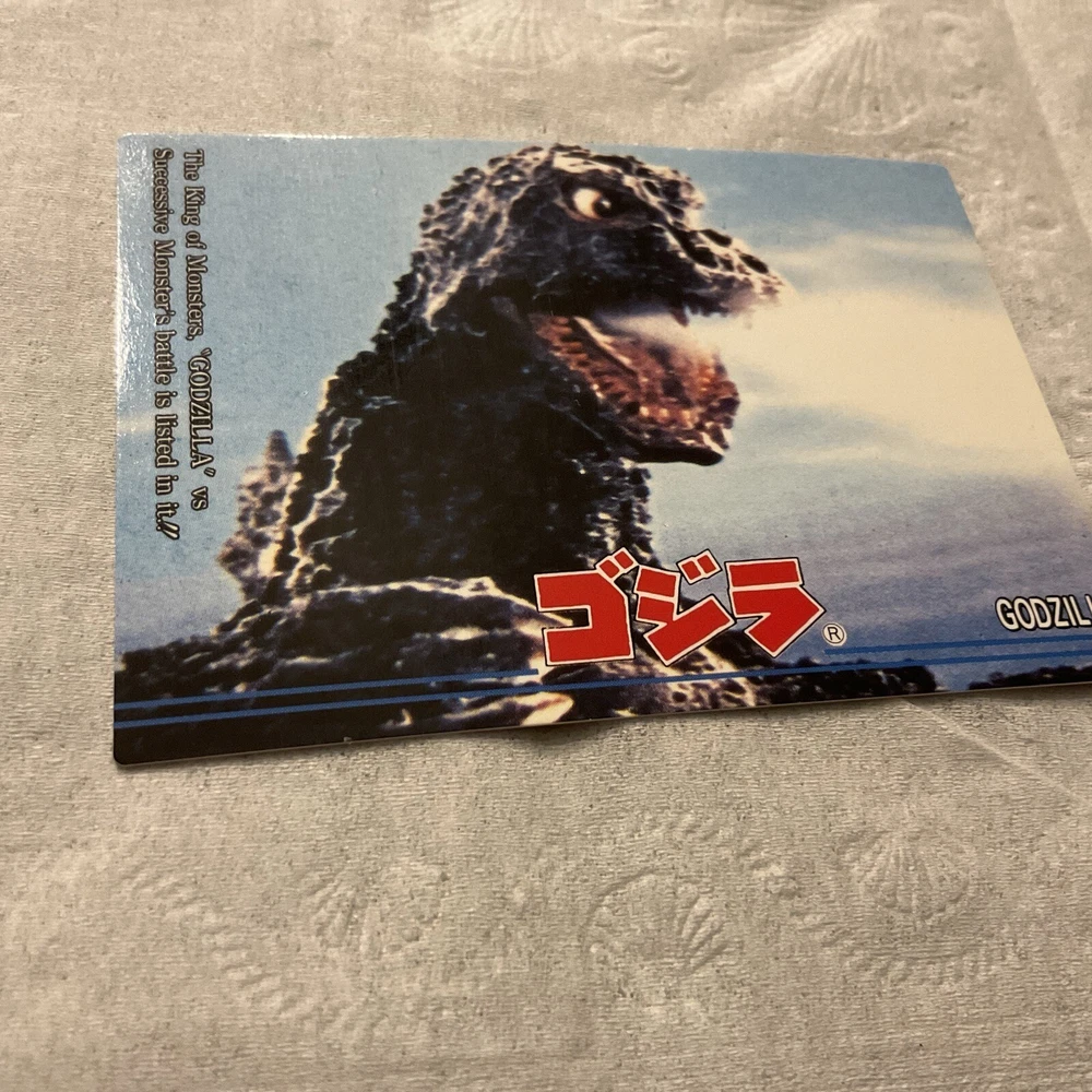 This is a Japanese Godzilla trading card from 1995. It features the iconic monster from the famous franchise and is part of the Trading Collection set by JPP Amada. The card is a standard size and made from card stock. It is an original, non-reprint card and is in very good condition. The card is not autographed and is written in Japanese. It is a great addition to any Kaiju or Godzilla collection and is sure to be a hit with fans. Don't miss your chance to own this piece of Godzilla history!
