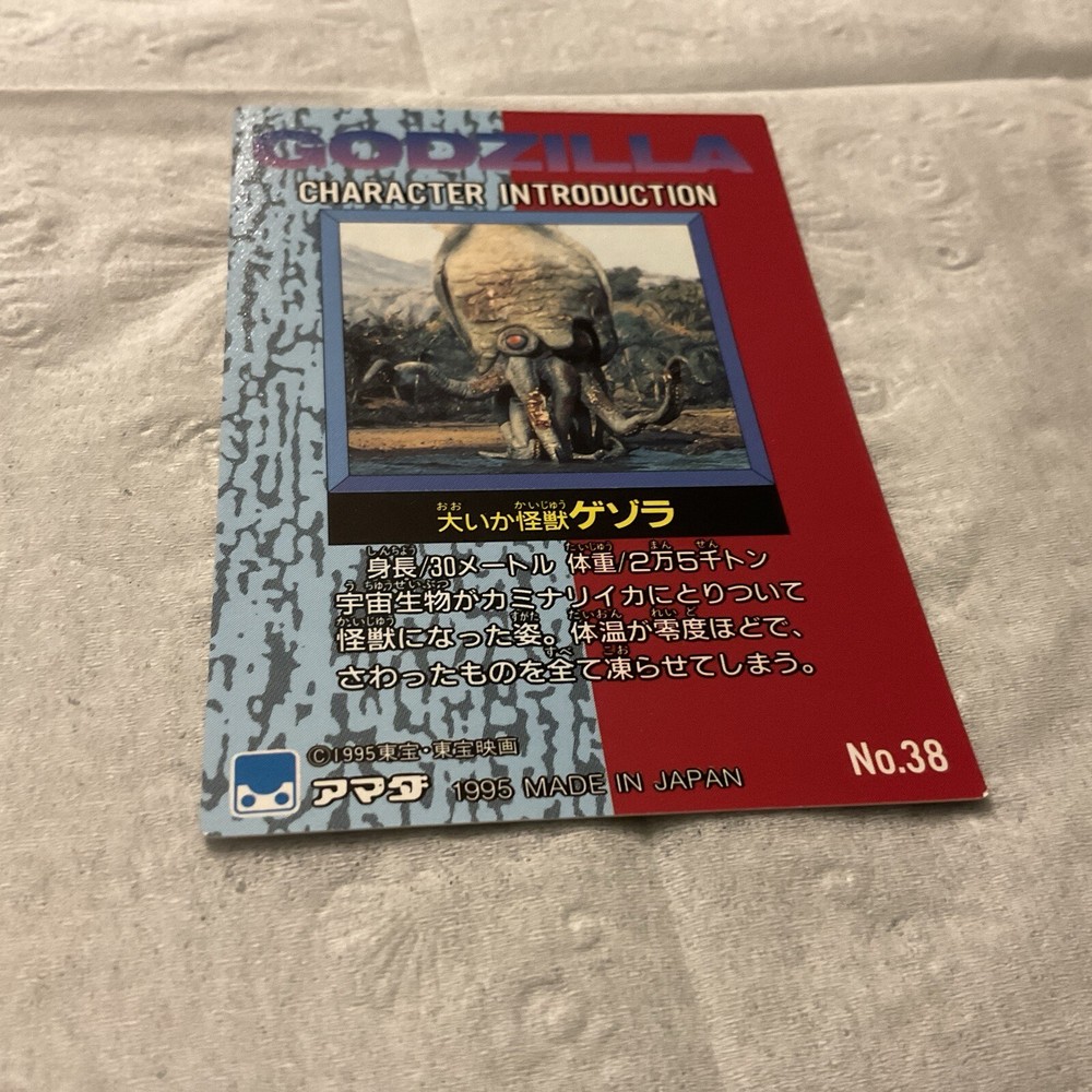 This rare Japanese non-sport trading card from the 1995 Godzilla Trading Collection is a must-have for any Kaiju fan. The card features an original design on high-quality card stock, with a standard size that fits perfectly in any collection. The card is part of the base trading card set and is in very good condition. It was manufactured by JPP Amada, a leading manufacturer in Japan. The card is not graded, but collectors can rest assured that it is an original and licensed reprint. Don't miss out on the chance to add this unique piece to your collection.