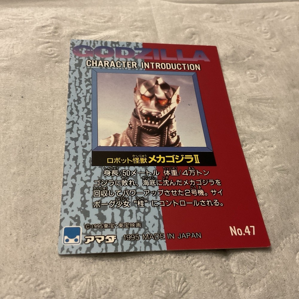 Up for sale is a Japanese non-sport trading card from the 1995 Godzilla Trading Collection. This card features a great image of Godzilla on the front and is in very good condition. The card is made of card stock and was manufactured by JPP Amada in Japan. This original card is a must-have for any kaiju or Godzilla fan. The card is ungraded and is a standard size. It is not autographed, but it is part of the trading card singles set. The card is written in Japanese and is an original, not a licensed reprint. Don't miss out on the chance to add this vintage card to your collection!