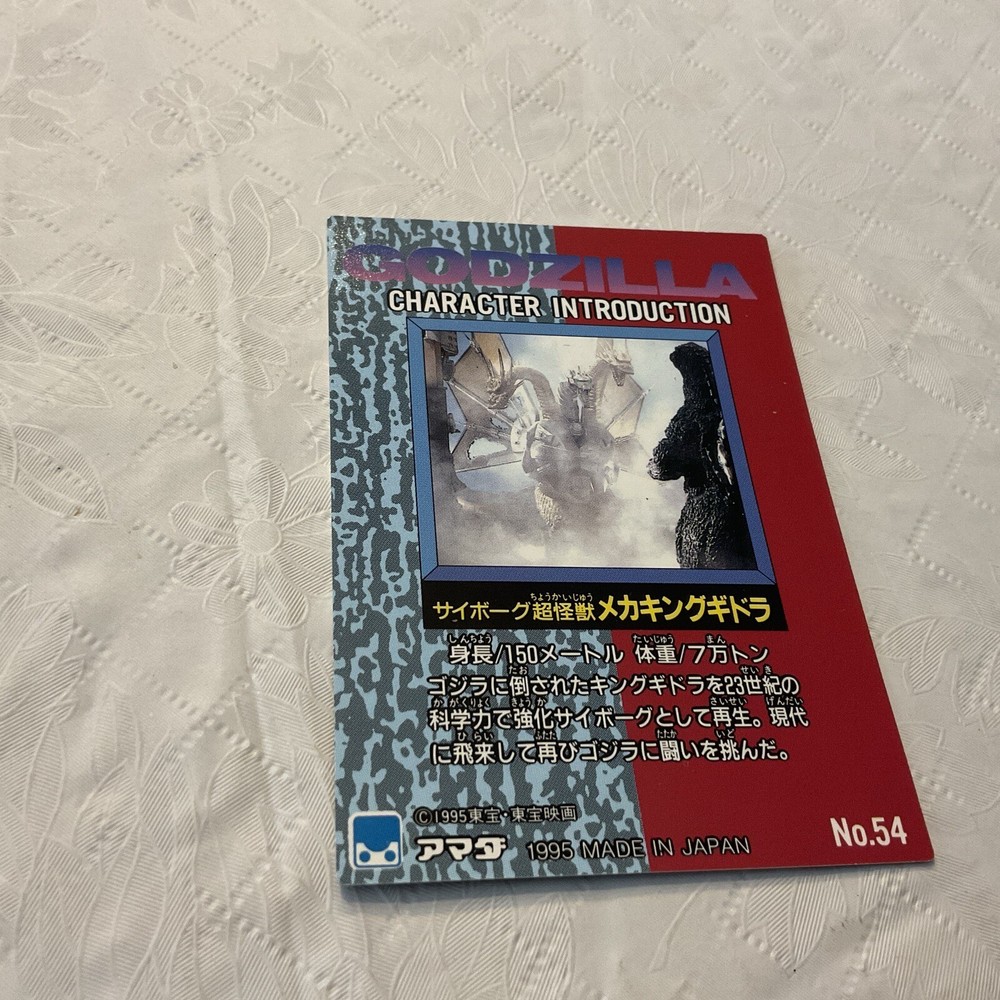 This Japanese trading card from JPP Amada features Godzilla, the iconic kaiju monster. The card is from the 1995 Trading Collection and is classified as a "Base Trading Card" with a card size of standard. The card is in very good condition and is an original, not a licensed reprint. The card is made of card stock and is written in Japanese. It is not autographed and is considered non-sport. The set is perfect for collectors who have an interest in kaiju and Godzilla specifically. Purchase this collectible today to add to your collection!