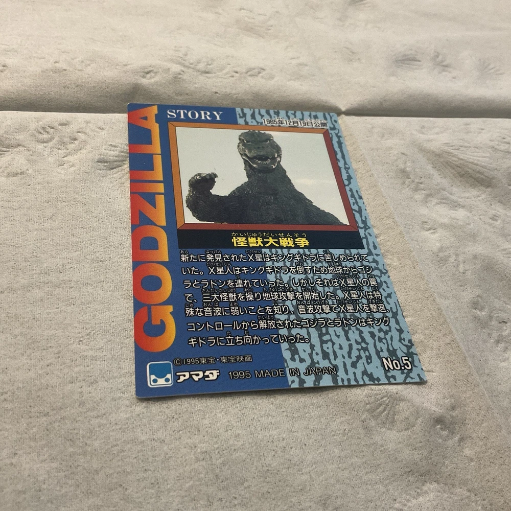 This Japanese Godzilla trading card is a must-have addition to any collection. This original 1995 JPP Amada card features the iconic monster and is part of the Trading Collection set. Measuring standard size, the card is made of high-quality card stock and is in very good condition. The card is non-autographed and is a base trading card, perfect for fans of the franchise. It is a great opportunity to add a piece of Kaiju history to your collection. The card is in its original form and is not a licensed reprint. The language on the card is in Japanese, and it was manufactured in Japan. So don't miss your chance to own this piece of Godzilla memorabilia!