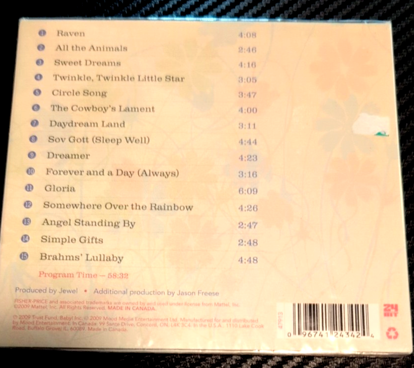 Jewel's "Lullaby" CD (Fisher Price) is BRAND NEW & FACTORY SEALED!!! BONUS BRAND NEW CD for the winner is entitled "Music For Babies, 1s & 2s"!!! Winner gets BOTH BRAND NEW CD's!!! ENJOY!!! Thank you for visiting and glad you're here! At Owlsnestkid we celebrate music entertainment and continuously strive to provide the very best selections for music enthusiasts like you! Check out everything in our store and please visit often as new titles are added regularly! :)) Check out our other items: http://www.ebay.com/sch/owlsnestkid/m.html?ssPageName=STRK%3AMEFSXS%3AMESOI&_trksid=p2053788.m1543.l2654