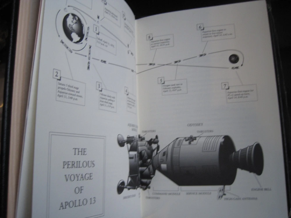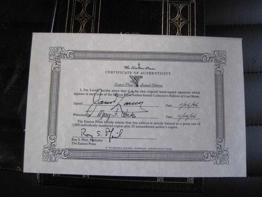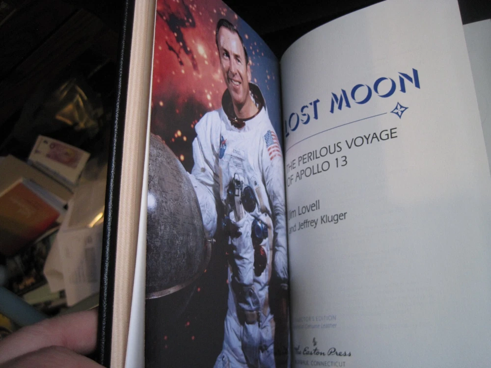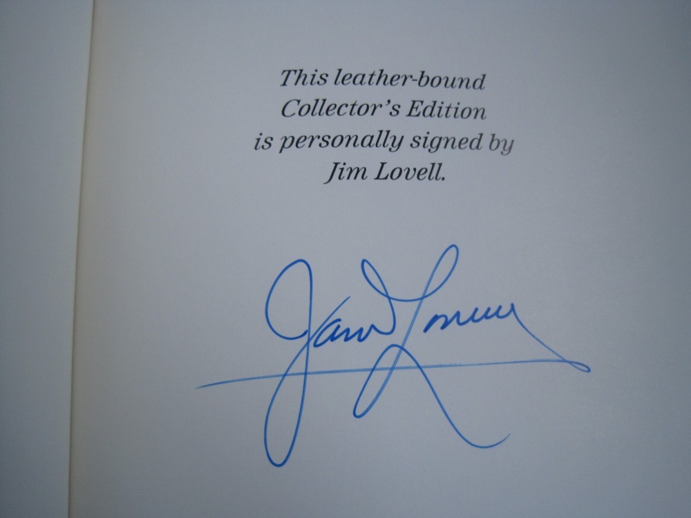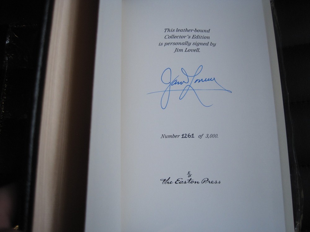 This is a leather bound signed collector's edition of Jim Lovell's best-selling autobiography - "Lost Moon" . Out of the seven Apollo expeditions to land on the moon, six of the efforts succeeded outstandingly and one failed. Lost Moon is the story of the failure and the incredible heroism of the three astronauts who brought their crippled vehicle back to earth. This account--written by Jim Lovell, commander of the mission, and his talented coauthor, Jeffrey Kluger--captures the high drama of that unique event and is told in the vernacular of the men in the sky and on the ground who masterminded this triumph of heroism, intellectual brilliance, and raw courage. A thrilling story of a thrilling episode in the history of space exploration. The book is unread and in great condition (see images). Signed by the former NASA astronaut on the limitation page, this is book number 1261 of only 3000 numbered copies ever printed. It includes the signed and dated certificate of authenticity. Easton Press books are the golden standard in the publishing industry, highly collectible and lasting generations. Easton Press Full Genuine Leather Dubbed Spine Accented Wit 22 kt. Real Gold Satin Ribbon Page Marker Distinctive Cover Design Gilded Page Edges To Protect Against Humidity High Quality Acid - Free paper Smyth-Sewn Pages Silk-Moire Endleaves I combine multiple items for savings on shipping charges. I ship worldwide. Please ask about international shipping charges and/or different shipping options. Please check out my other auctions for several rare signed books for sale. Thank you!
