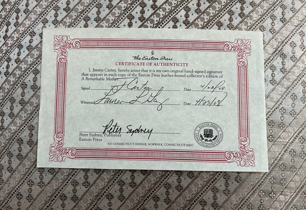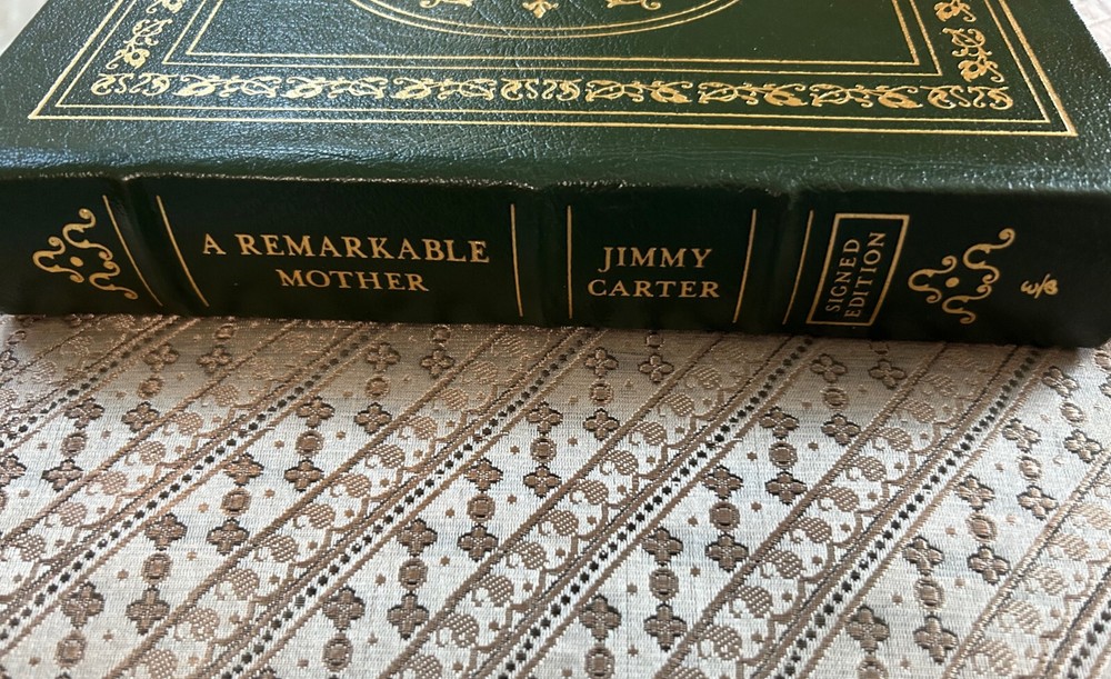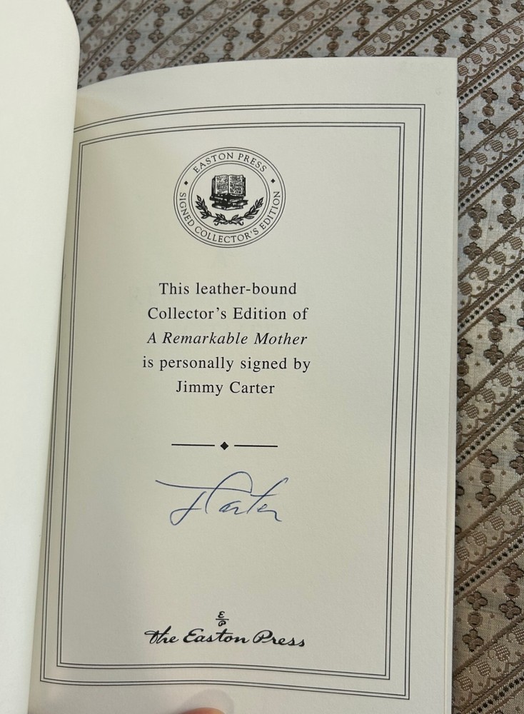 James Earl Carter Jr. October 1, 1924 - December 29, 2024 , was an American retired politician who served as the 39th president of the United States from 1977 to 1981. A member of the Democratic Party, he previously served as the 76th governor of Georgia from 1971 to 1975 and as a Georgia state senator from 1963 to 1967. After leaving office, he remained engaged in political and social projects, receiving the Nobel Peace Prize in 2002 for his humanitarian work. "LIKE NEW UNREAD CONDITION" HAND AUTOGRAPHED SIGNED copy of President Jimmy Carter's "A Remarkable Mother". Published in 2008 by The Easton Press. This rare beautiful hardcover is straight and square. The pages are crisp and clean. The book is unread. Includes a certificate of authenticity by President Jimmy Carter and Easton Press Publisher dated 4/22/08. Features include Easton Press qualities: Premium Leather, Silk Moire end leaves, Distinctive Cover Design, Hubbed Spine, Accented in Real 22KT Gold, Satin Ribbon Page Marker, Gilded Page Edges, Long-lasting, High-Quality Acid-neutral Paper, Smyth-sewn Pages for Strength and Durability. An increasingly difficult title to find signed, in such fine condition. Please view all pictures for details as part of the description and bid with confidence. All items come from an exceptionally clean, smoke-free home. ALL MY ITEMS SOLD HAVE A 100% UNCONDITIONAL MONEY-BACK GUARANTEE