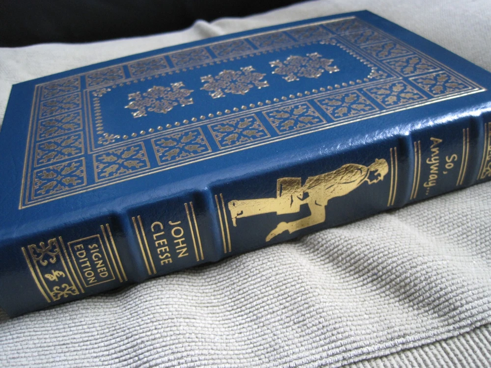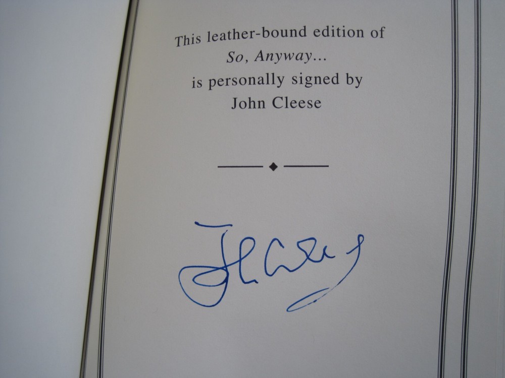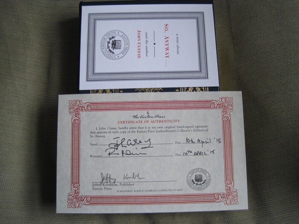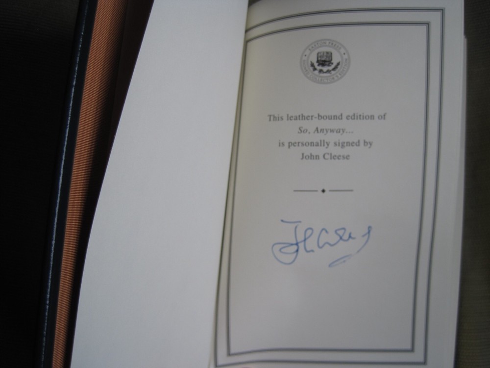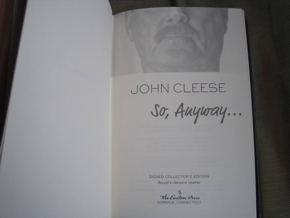 This is a leather bound signed collector's edition of John Cleese's best-selling memoir - "So, Anyway...", a fascinating book written by the famous British actor, comedian, and founding member of the Monty Python comedy group. The book is unread, and in great condition (see images). Signed by the famous British actor on the limitation page, it also includes a signed and dated certificate of authenticity, and the publisher's note card. Easton Press books are the golden standard in the publishing industry, highly collectible and lasting generations. Easton Press Full Genuine Leather Dubbed Spine Accented Wit 22 kt. Real Gold Satin Ribbon Page Marker Distinctive Cover Design Gilded Page Edges To Protect Against Humidity High Quality Acid - Free paper Smyth-Sewn Pages Silk-Moire Endleaves I combine multiple items for savings on shipping charges. I ship worldwide. Please ask about international shipping charges and/or different shipping options. Please check out my other auctions for several rare signed books for sale. Thank you!
