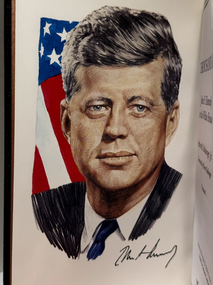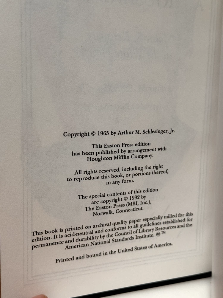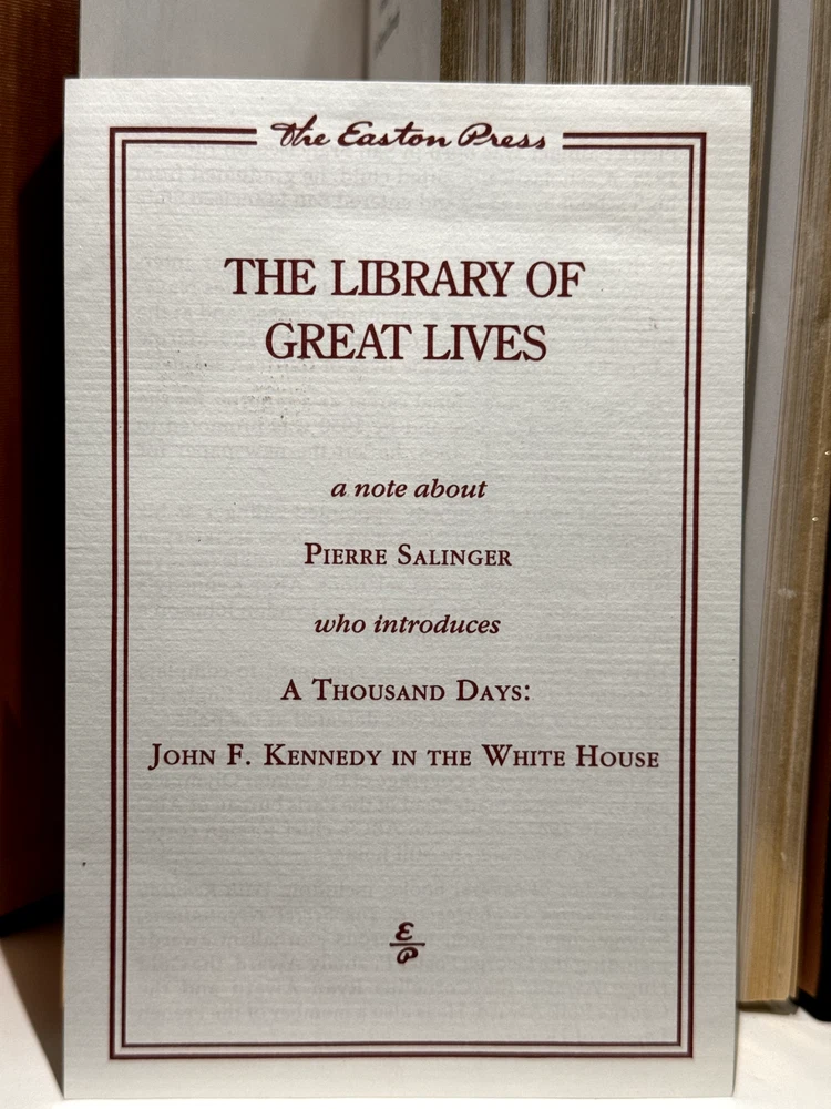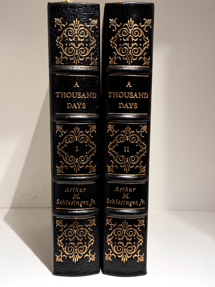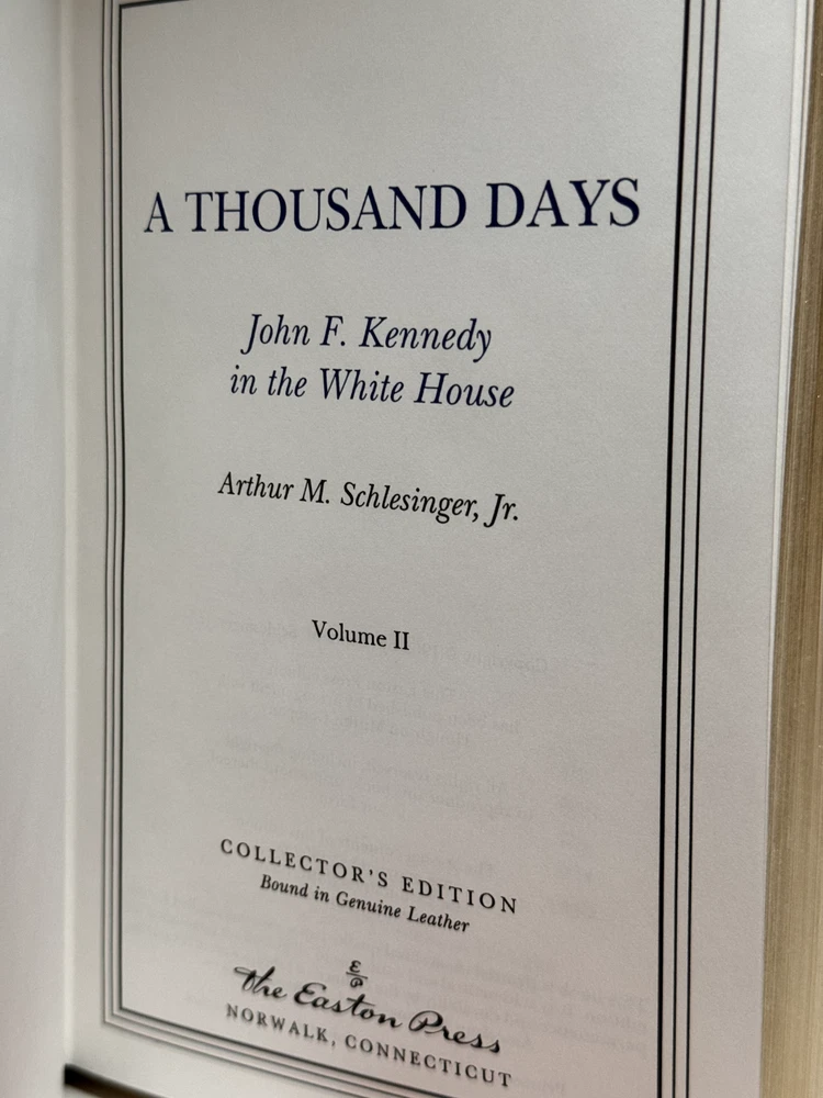 You are bidding on a copy of the Easton Press' LIBRARY OF GREAT LIVES series edition of Arthur M. Schlesinger Jr.'s A THOUSAND DAYS: JOHN F. KENNEDY IN THE WHITE HOUSE. The book is one of the most famous and respected biographies of John F. Kennedy, with an emphasis on his time while serving as the 35th President of The United States of America. Foreword by Pierre Salinger. Bound in beautiful genuine moroccan cowhide leather, the book features raised bars on the spine, gold tooling on the cover and spine, Moire ribbed endpages, satin silk sewn-in bookmark, 22k gold dust on page ends on all 3 sides. Printed on archival quality acid-neutral paper, that will last for generations without diminishing in quality or looks. LIMITED, COLLECTOR'S EDITION, PRINTED SPECIALLY FOR SUBSCRIBERS TO THE LIBRARY OF GREAT LIVES. Free Shipping in all of Continental United States. All other buyers, please check with me for shipping rates before bidding. See my other listings. I have a large collection of rare and collectible books, most leather-bound, others of first edition, first printing, even unpublished manuscripts. I will combine them during shipping so you can receive them together. Just message me your intent to buy more than one book, and I will hold them to be shipped together. Happy Buying!