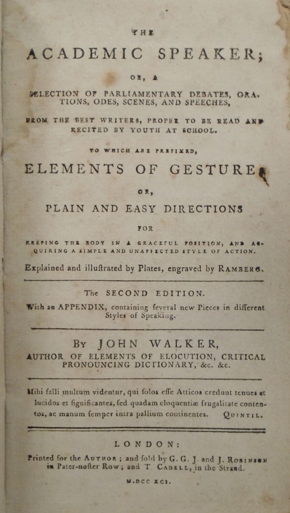 The Academic Speaker, or a Selection of Parliamentary Debates, Orations, Odes, Scenes and Speeches, from the Best Writers, Proper to be Recited By Youth at School, to Which is Prefixed Elements of Gesture or Plain and Easy Directions. Graceful Position WALKER, John Published by London: Printed for the Author, 1791. Second Edition Very Good, leather with wear