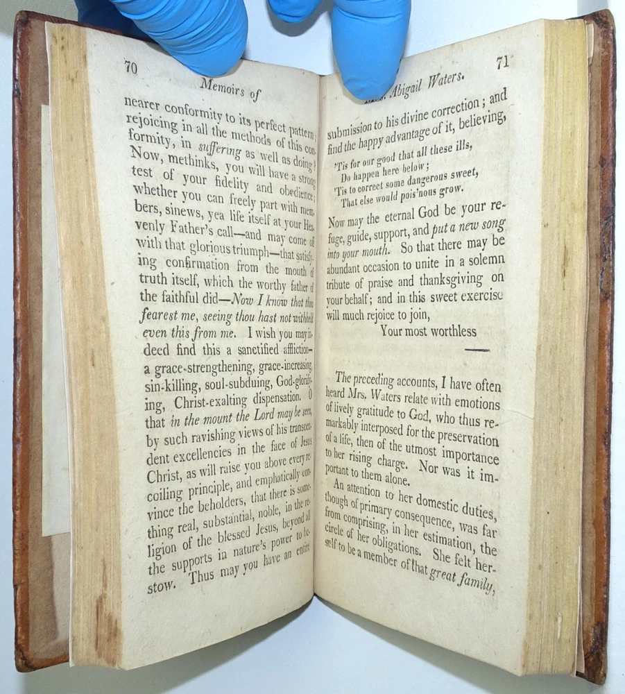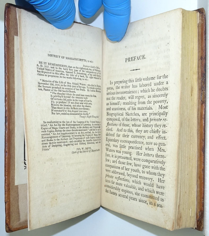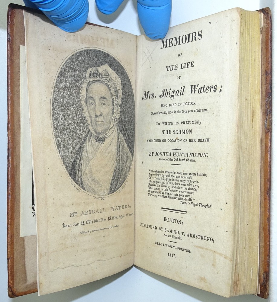 DETAILS: Title: Memoirs Of The Life Of Mrs. Abigail Waters; Who Died In Boston, November 22nd, 1816, In The 96th year of her age. To Which Is Prefixed, The Sermon Preached On Occasion Of Her Death. Author : Joshua Huntington . Date Published: 1817. Place Published: Boston, Massachusetts. Published by: Samuel T. Armstrong . Size: Approx 5 7/8" x 3 3/4" x 3/4". CONDITION: Overall: Good. Early, (probably original) boards. Neatly re-backed! Pages: Good. First front free endpaper heavily foxed. A few neat page repairs to endpapers. Otherwise some moderate foxing and or soiling , ( please see pictures) . Binding: Excellent. Hinges: Excellent / replaced . Hardcovers: Good to very good with some wear, (please see pictures) . Spine: Excellent / replaced, (please see pictures).