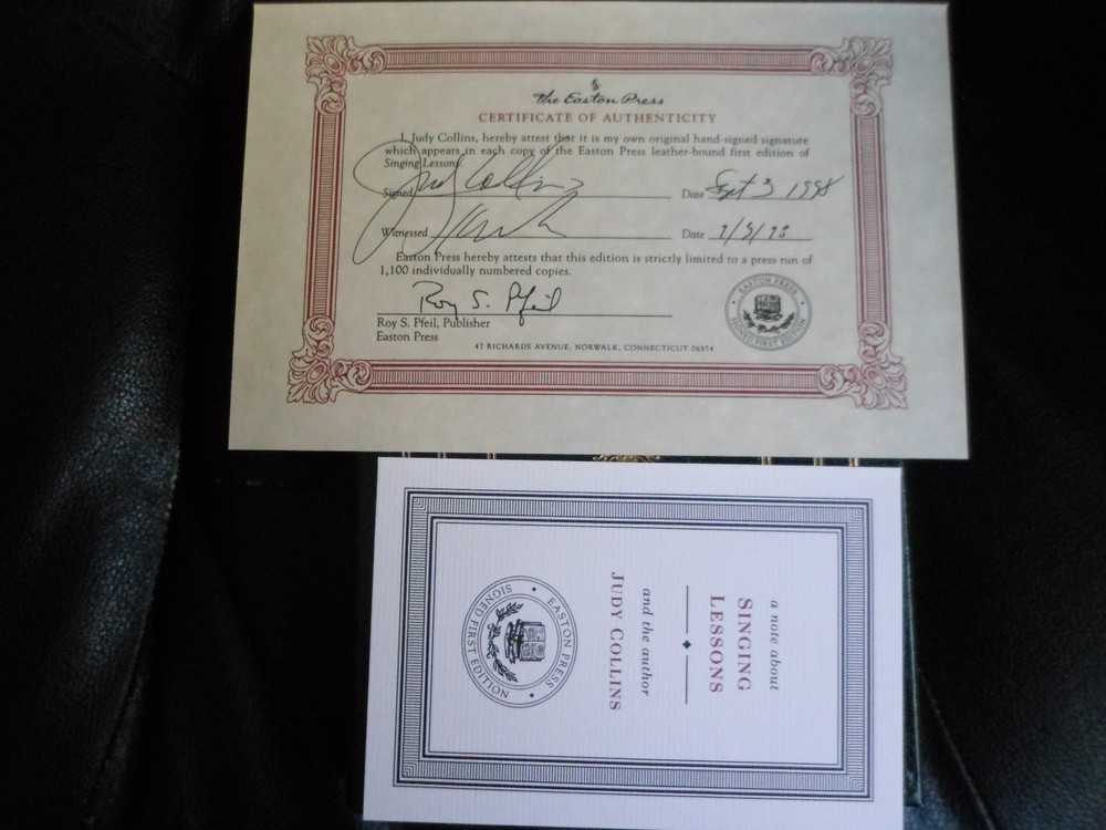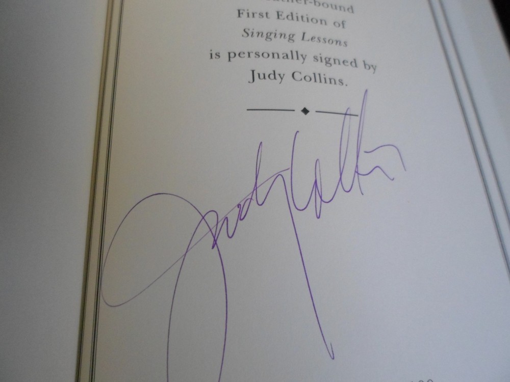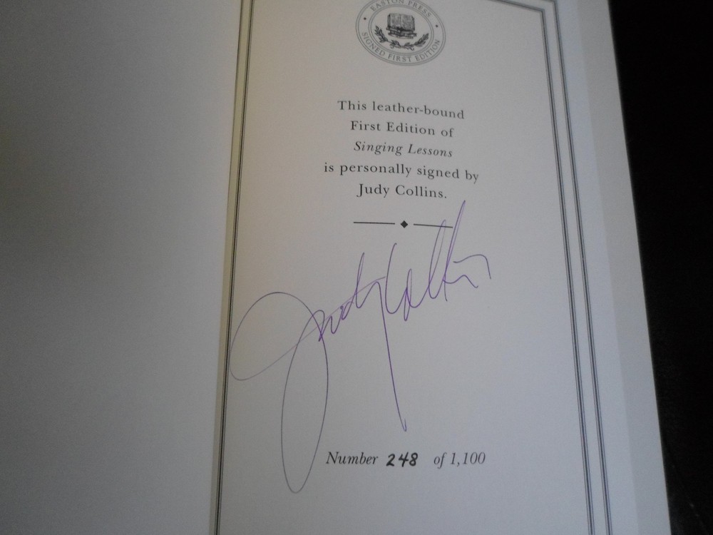This is a leather bound signed numbered first edition of Judy Collins' best-selling autobiography - "Singing Lessons - A Memoir of Love, Loss, Hope, and Healing", a fascinating book written by the famous folk, country, and rock and roll music legend. A very exciting reading, describing both her successful music career and her dramatic personal life. For the millions who know Judy Collins' unforgettable music, this remarkable memoir will come as no surprise. A moving account of growth and healing, memory and rebirth, dreams and meditations, this is Judy's heart statement, imbued with the introspection we love in her songs. From coping with every mother's greatest sorrow -- the loss of a child -- to the shock of seeing her companion of fifteen years nearly die, hers is a ballad of transformation in which some of life's worst tragedies lead to the discovery of a deeper love. More than an intimate memoir, "Singing Lessons" is the triumph of a keenly observant, brilliantly gifted artist -- a deeply affecting and eloquently written journal of a woman determined to keep her heart open, her spirit intact, and all the elements of her life in harmony. It is the heart and soul of Judy Collins. The book is in great unread condition and it is signed by the famous music legend on the limitation page. There are light imperfections of the gold gild and a corner that is a little bumped (see images). This is number 248 of only 1100 signed and numbered copies ever printed. Easton Press books are the golden standard in the publishing industry, highly collectible and lasting generations. Easton Press Full Genuine Leather Dubbed Spine Accented Wit 22 kt. Real Gold Satin Ribbon Page Marker Distinctive Cover Design Gilded Page Edges To Protect Against Humidity High Quality Acid - Free paper Smyth-Sewn Pages Silk-Moire Endleaves I combine multiple items for savings on shipping charges. I ship worldwide. Please ask about international shipping charges and/or different shipping options. Please check out my other auctions for several rare signed books for sale. Thank you!