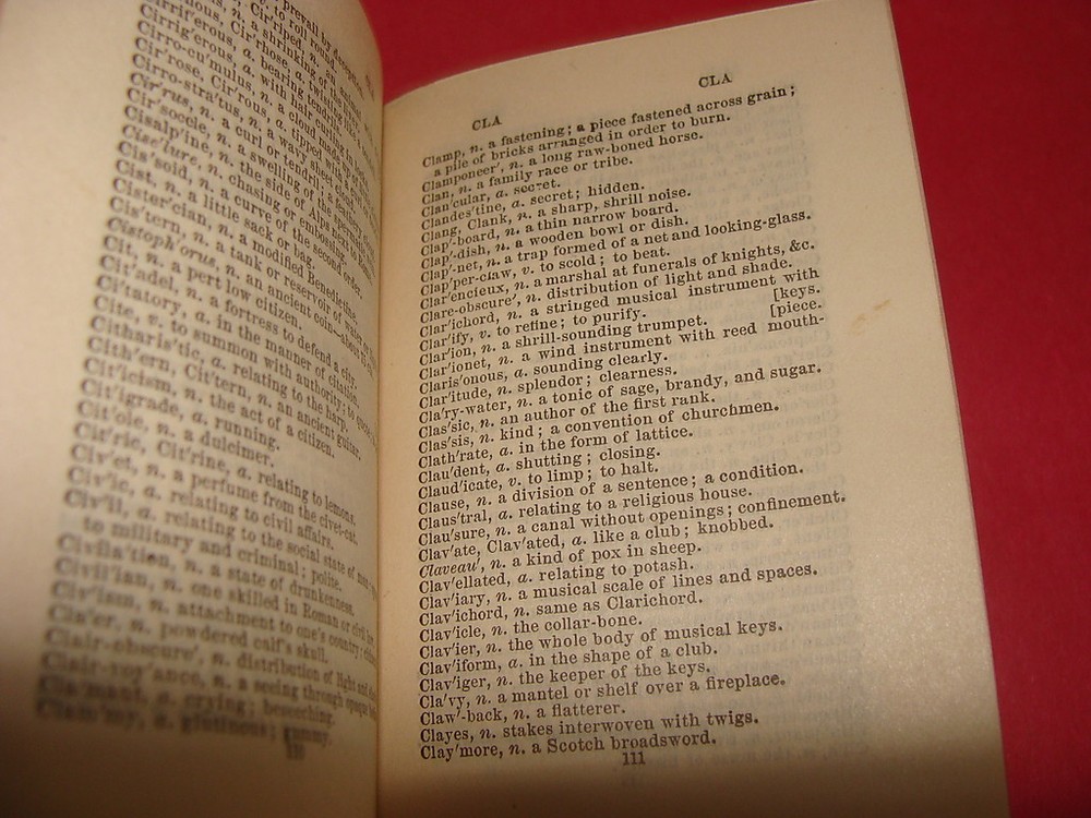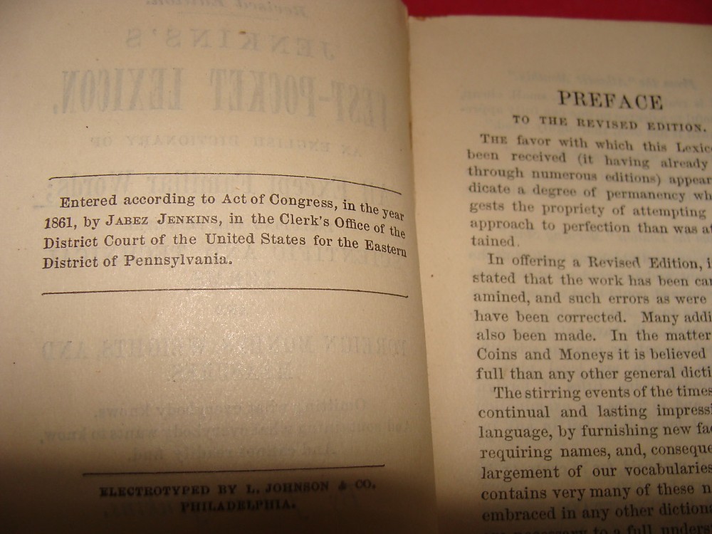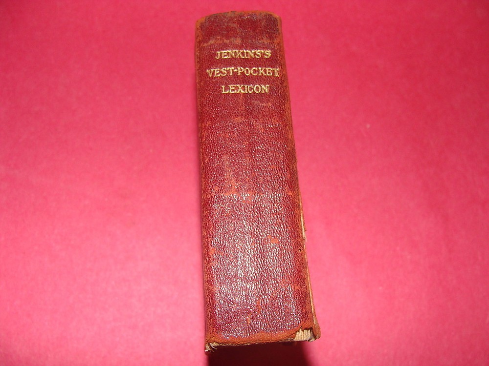 Jenkins's Vest-Pocket Lexicon 1861 An English dictionary of all except familiar words; including the principal scientific and technical terms and foreign moneys, weights and measures. Omitting what everyone knows and containing what everyone wants to know and cannot easily find out. by Jabez Jenkins, J B Lippincott Co, Philadelphia 563 pages, a bit over 3.5" x 2.5", burgundy leather, gold gilt edges. Note: as I was photographing this very rare book the front end paper and the title page came loose. ********************************************* Be sure to add me to your favorites list ! More from ennairam Collectible antique, vintage & new items: fiction & non-fiction books, texts & instruction manuals, cookbooks, magazines, travel souvenirs,royal memorabilia, railroadiana, instructional music books, classical and popular printed music, antique, vintage & contemporary sheet music, Christmas items (in season), records, cassettes & CDs, opera & theater programs, librettos, VHS tapes, craft manuals, children's series books, postcards, collectible stamps, maps, old photos, religious items, pins, charms, ephemera,and much more. Check back often- I am always adding items! Check out my other items ! Please Note: This wonderful item has been previously owned and is listed as used unless specifically listed as new. Please look at the photo(s) carefully as vintage items, especially paper items rarely are in mint condition. Please expect normal wear due to age and handling.