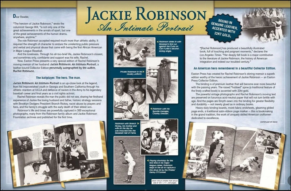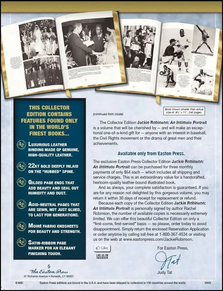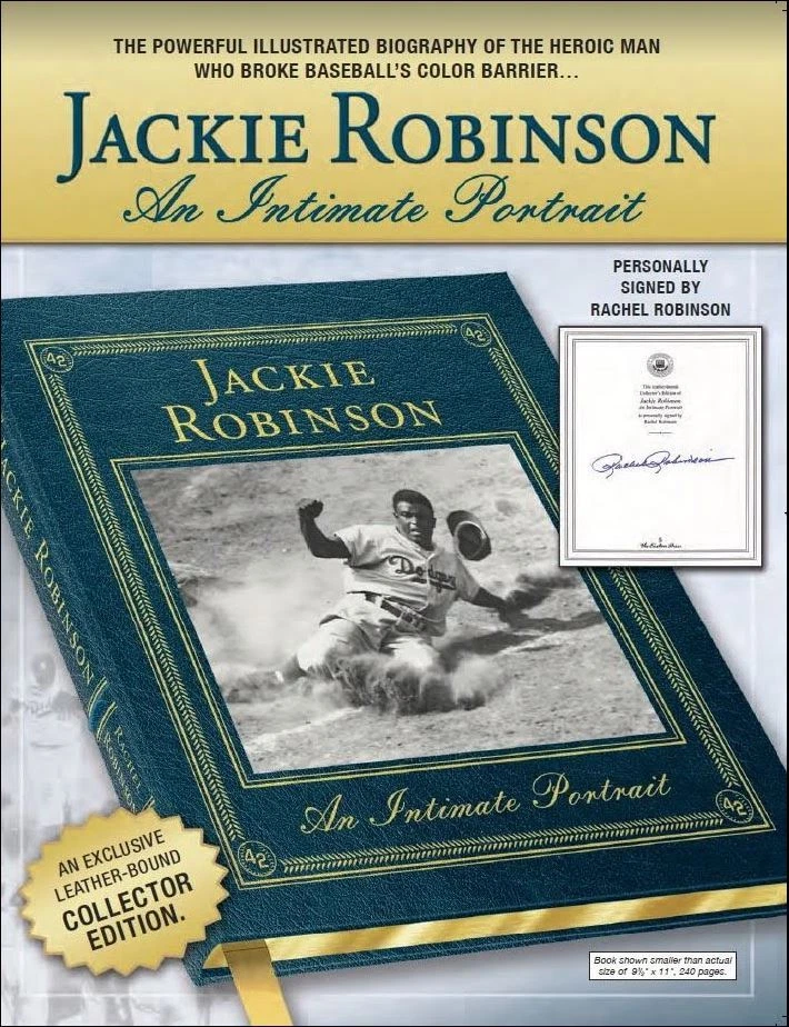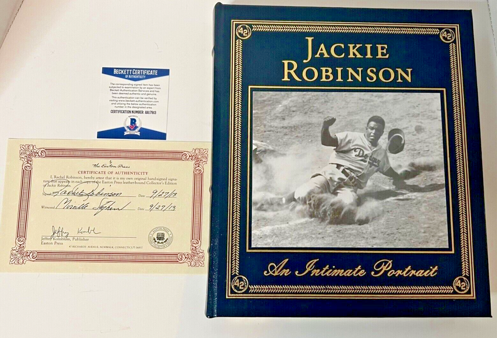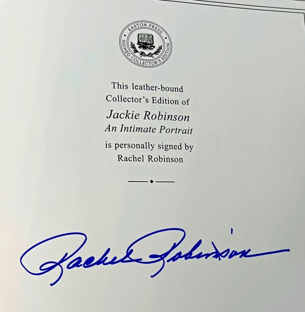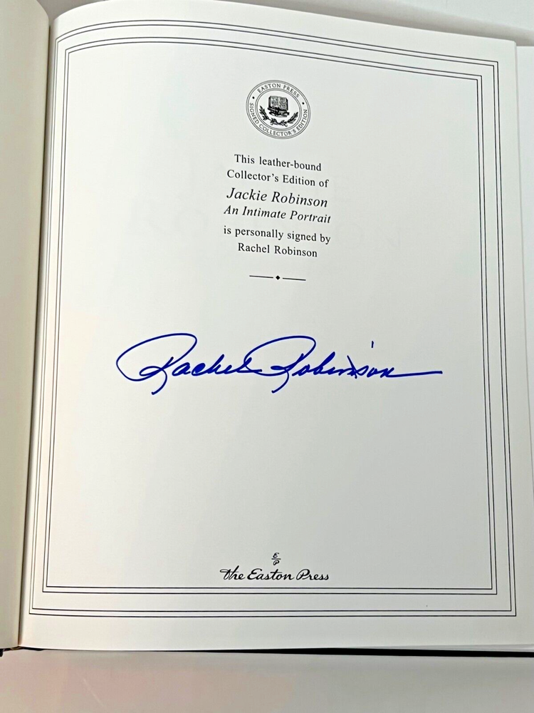 This is a collector's edition of "Jackie Robinson an Intimate Portrait" published by Easton Press. The book is signed by Rachel Robinson, the wife of baseball legend Jackie Robinson. It also comes with a Certificate of Authenticity from Beckett. The book contains a biography of Jackie Robinson and his role in breaking the color barrier in baseball and civil rights. The binding is made of leather and has 22K gold accents. This book is a must-have for any baseball fan and collector.