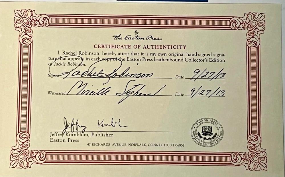 This signed Easton Press edition is absolutely stunning—the leather binding and 22K gold detailing make it feel like a treasure. Rachel Robinson’s signature adds such a personal and historic touch, especially paired with the Beckett Certificate of Authenticity. The detailed biography celebrates Jackie Robinson’s incredible legacy in baseball and civil rights. For fans and collectors, this is more than just a book—it’s a priceless piece of history. Highly recommended!