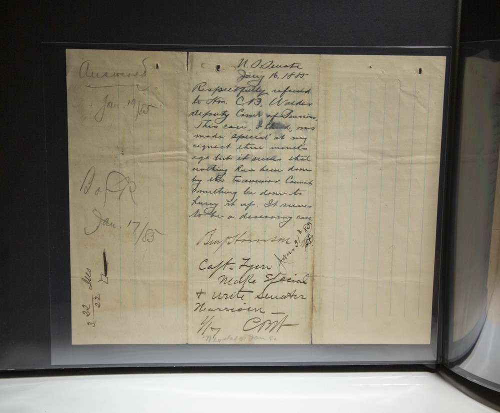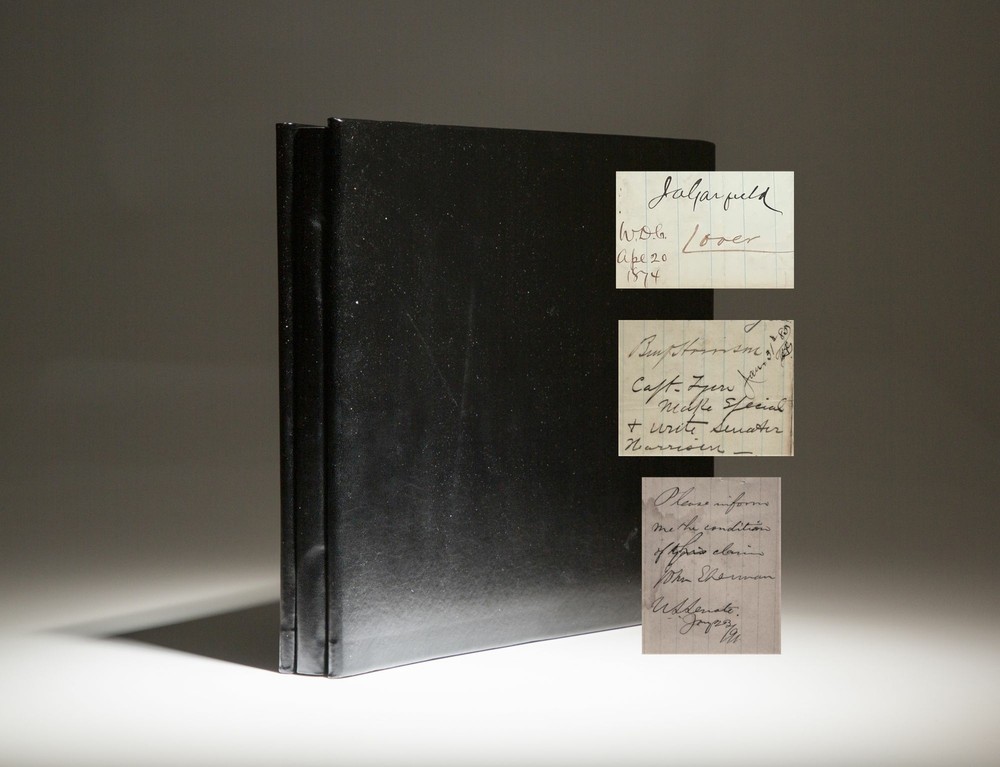 Archive of Political Letters: Pensions Author: [Garfield, James A.] [Harrison, Benjamin] [Lodge, Henry Cabot] [Taft, Charles P.] [Sherman, John] Title: Archive of Political Letters: Pensions Publication: [Washington, DC]: 1800-1900 Edition: Letters Description: A collection of 50 letters to political leaders regarding veteran pensions, many with notes from senators asking for help from the Bureau of Pensions. Letters. Letters. Letters from the following notable individuals include: Benjamin Harrison (1885), James A. Garfield (1874), John Sherman (1891), Charles P. Taft (1896), Henry Cabot Lodge (1897), William Henry Moody (1897), George Frisbie Hoar (1897), Thomas W. Palmer (1894), Nelson W. Aldrich (1886), Richard Pearson Hobson (1909), Francis Cockrell (1891), James Francis Burke (1910), Thomas Kearns (1903). Pension requests include veterans of the Indian Wars, War of 1812, Mexican War and the Civil War (War of the Rebellion). Housed in black leather archival portfolio. Majority of letters were addressed to James P. Burrill, a former Union Soldier and Bureau of Pensions Official. A unique collection of letters, considering the political fortune of President Benjamin Harrison was largely attributed to his willingness to grant pension requests. President James A. Garfield campaigned in 1880 against federally funded confederate pensions and easily won the presidency. The process for awarding pensions to United States military veterans was a process fraught with controversy and corruption in the late nineteenth century. After the Civil War, pensions were awarded to disabled soldiers based on their length of service. In 1879, the Arrears Act increased the number of eligible veterans and awarded lump sum payments to many. In 1890, the Dependent Pension Act was passed, greatly increasing government support for veterans who were unable to do manual labor, either because of their war injuries or not. In 1907, old age was added as a disability, thereby increasing government support. The last Civil War pensioner was Albert Woolson who died in 1956, with the last widow of a veteran passing away in 2008. Seller ID: 2431 Subject: Presidents The First Edition The First Edition offers collectors the finest selection of notable rare books by important world figures. Located in Cincinnati, Ohio and Vero Beach, FL, we take great pride in carrying books that are important around the world, but also in our local community . We're proud members of the Independent Online Booksellers Association (IOBA), the Midwest Antiquarian Booksellers Association, the Northern Ohio Bibliophilic Society and the Better Business Bureau of Cincinnati. Terms All orders ship within two business days. Standard mail is USPS Media Mail. Expedited and international shipping are also available. We offer combined shipping on multiple orders. All items are guaranteed to be as described or they may be returned within 30 days of receipt for a full refund. This listing was created by Bibliopolis.