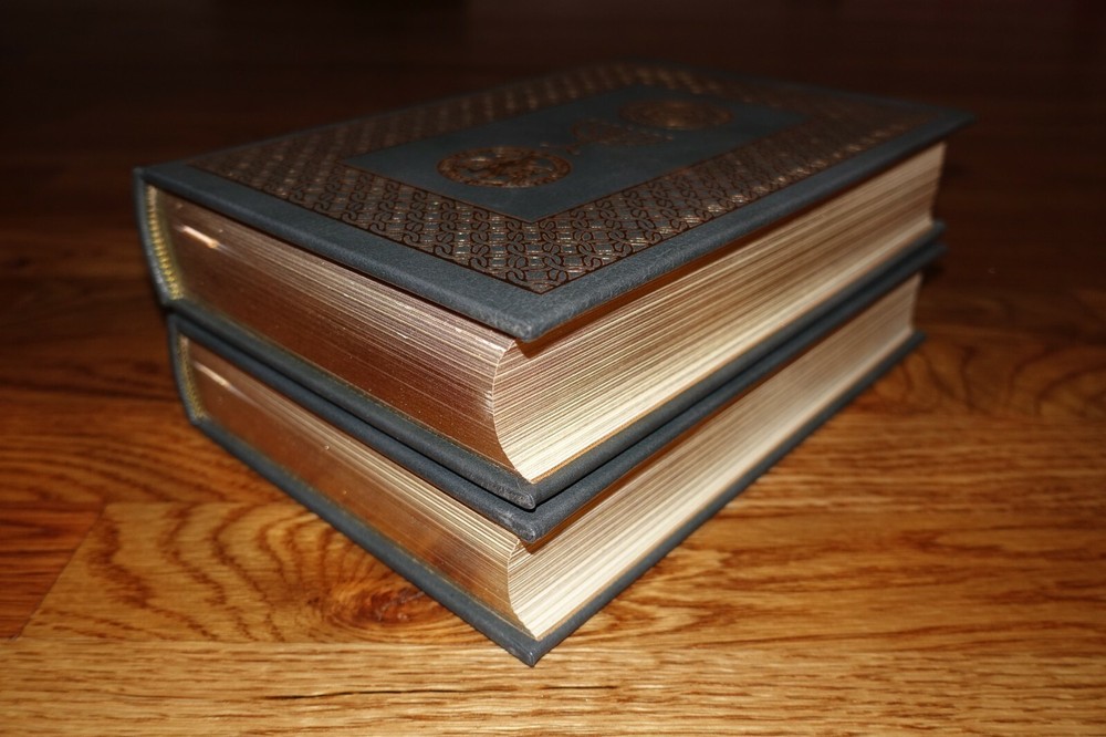 Bindings are tight in both volumes and neither has any wear or damage to note inside. No bookplates have been affixed. Leather covers do not have any wear or damage to note. The only wear I can find is some light rubbing or chipping to the page edge gilt in a few small areas. I have tried to take close-up photos of the page edge gilt to show what I am describing. Please feel free to contact me with any questions.