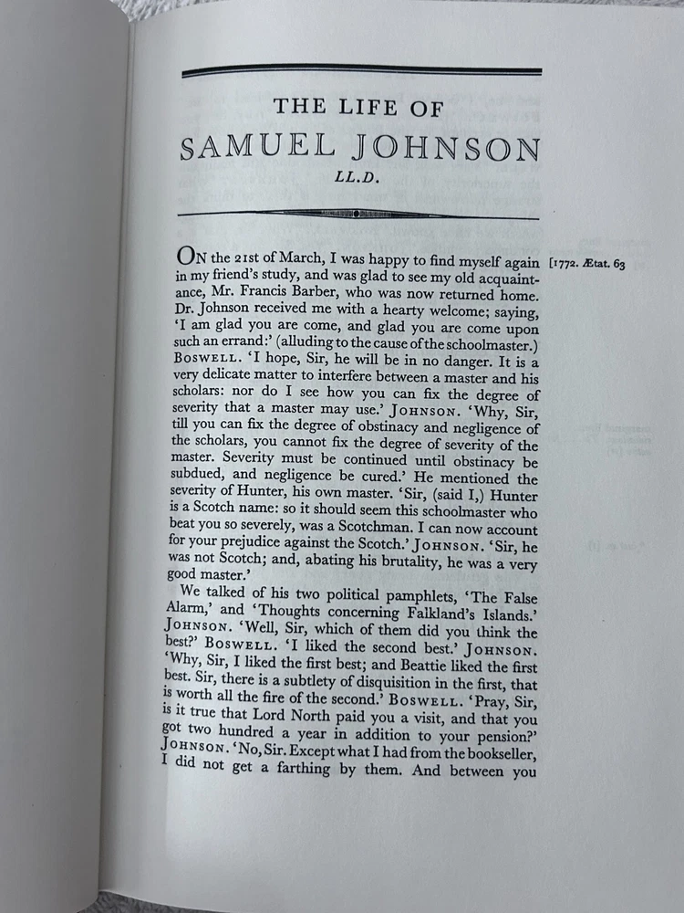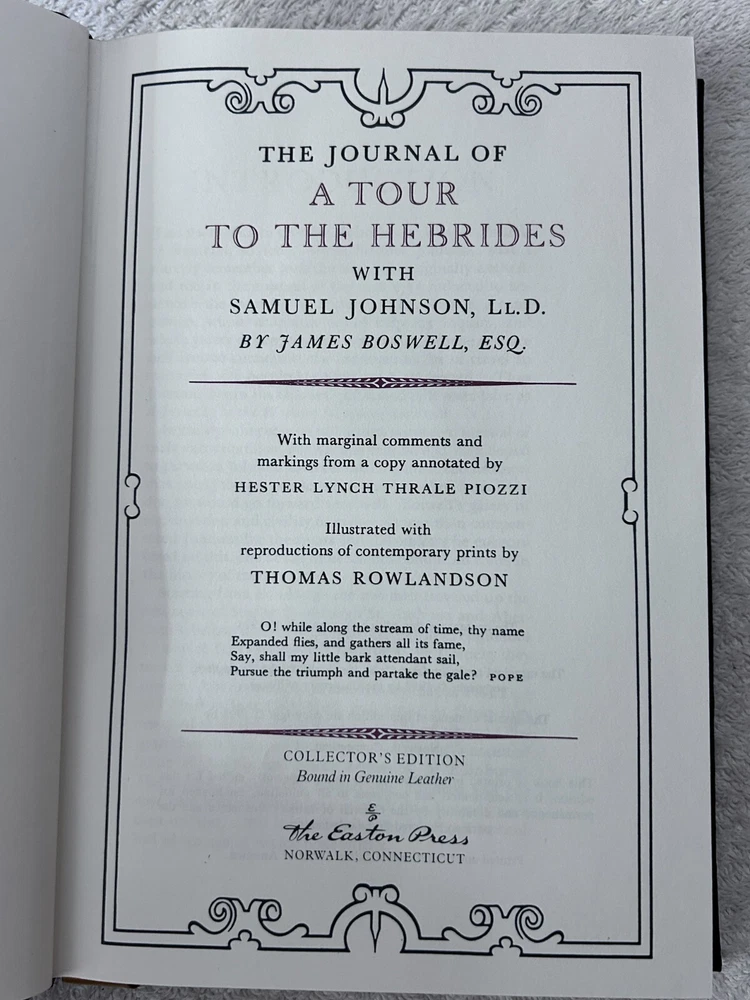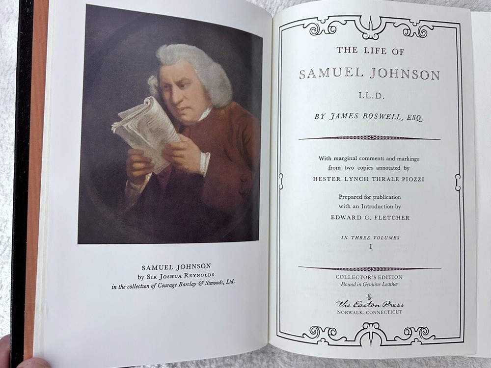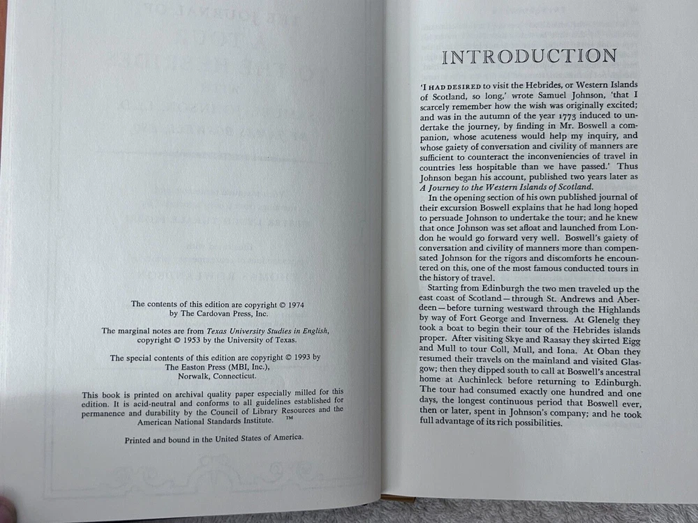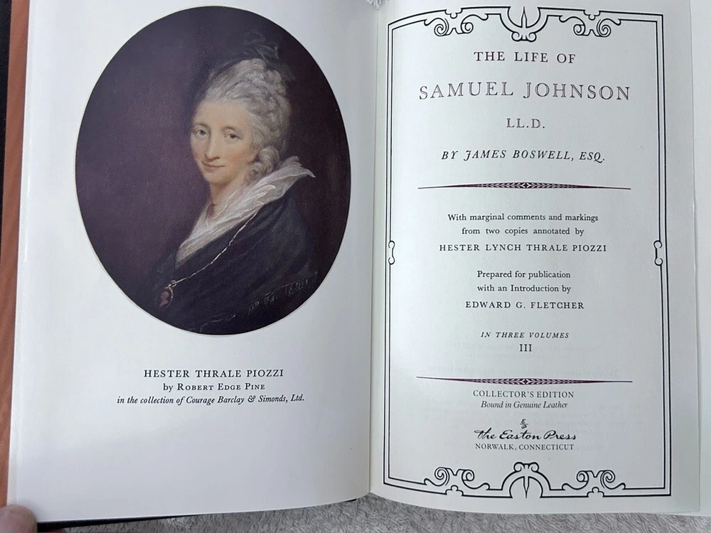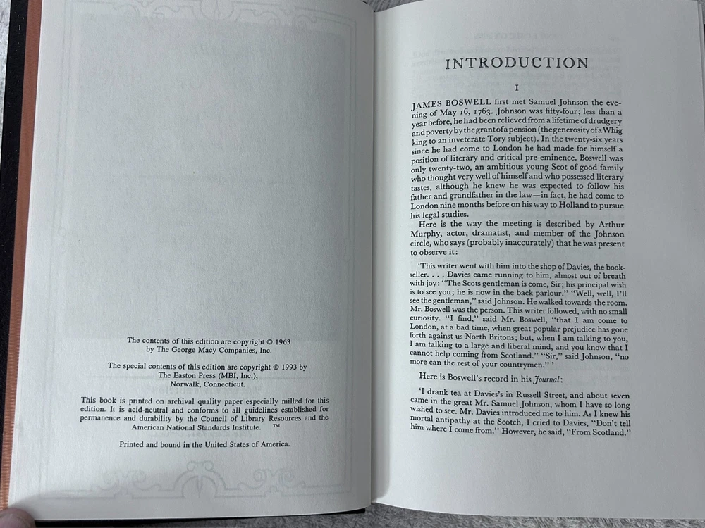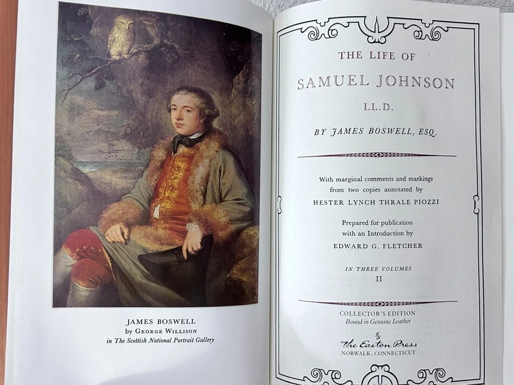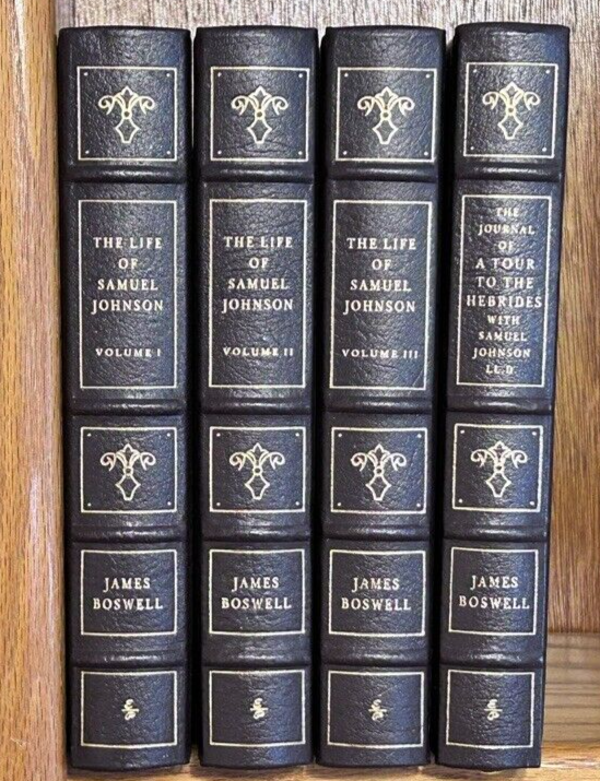 Features of this Easton Press Illustrated Collection include: Fully and tightly bound in genuine leather. 22kt gold accents deeply inlaid on the "hubbed" spine. Heavy duty binding boards enhance the book’s durability. Superbly printed on acid-neutral paper that lasts for generations. Sewn pages — not just glued like ordinary books. Handsome moiré endpages and a satin-ribbon page marker. Gilded page ends. Printed and bound in the USA using imported materials. Rigorous inspection at every stage ensures adherence to our exacting standards. Superb craftsmanship and commitment to quality. These Easton Press editions are printed on sturdy, acid-neutral paper specially milled for this edition that conforms to all guidelines established for permanence and durability by the Council of Library Resources and the American National Standards Institute. James Boswell, The Life of Samuel Johnson LL.D. Volume I, II & III and James Boswell, Tour to the Hebrides With Samuel Johnson LL.D. Easton Press, Norwalk CT 1993. James Boswell "The Life of Samuel Johnson" Full genuine leather. Howard Pyle (illustrator). Limited Edition. With marginal comments and markings from two copies annotated by Hester Lynch Thrale Piozzi. Prepared for publication with an introduction by Edward G Fletcher. Uniform brown leather bindings, distinct cover designs with decorations, frontispiece portrait in full color. This collection is now out of print. A complete matching set of four volumes. About Samuel Johnson Johnson, was an English writer who made lasting contributions to English literature as a poet, essayist, moralist, literary critic, biographer, editor and lexicographer. He was a devout Anglican and a generous philanthropist. Politically, he was a committed Tory. The Oxford Dictionary of National Biography describes Johnson as "arguably the most distinguished man of letters in English history". He is also the subject of James Boswell's The Life of Samuel Johnson, described by Walter Jackson Bate as "the most famous single work of biographical art in the whole of literature". Born in Lichfield, Staffordshire, Johnson attended Pembroke College, Oxford, for just over a year, but a lack of funds forced him to leave. After working as a teacher, he moved to London, where he began to write for The Gentleman's Magazine. His early works include the biography Life of Mr Richard Savage, the poems London and The Vanity of Human Wishes, and the play Irene. About James Boswell James Boswell, 9th Laird of Auchinleck (/ˈbɒzwɛl, -wəl/; 29 October 1740 – 19 May 1795), was a Scottish biographer and diarist, born in Edinburgh. He is best known for the biography he wrote of his friend and contemporary, the English literary figure Samuel Johnson, which is commonly said to be the greatest biography written in the English language. Boswell's surname has passed into the English language as a term (Boswell, Boswellian, Boswellism) for a constant companion and observer, especially one who records those observations in print. In "A Scandal in Bohemia", Sir Arthur Conan Doyle's character Sherlock Holmes affectionately says of Dr. Watson, who narrates the tales, "I am lost without my Boswell." Features Includes all the classic Easton Press qualities: * Premium Leather * Silk Moire Endleaves * Distinctive Cover Design * Hubbed Spine, Accented in Real 22KT Gold * Satin Ribbon Page Marker * Gilded Page Edges * Long-lasting, High Quality Acid-neutral Paper * Smyth-sewn Pages for Strength and Durability * Beautiful Illustrations