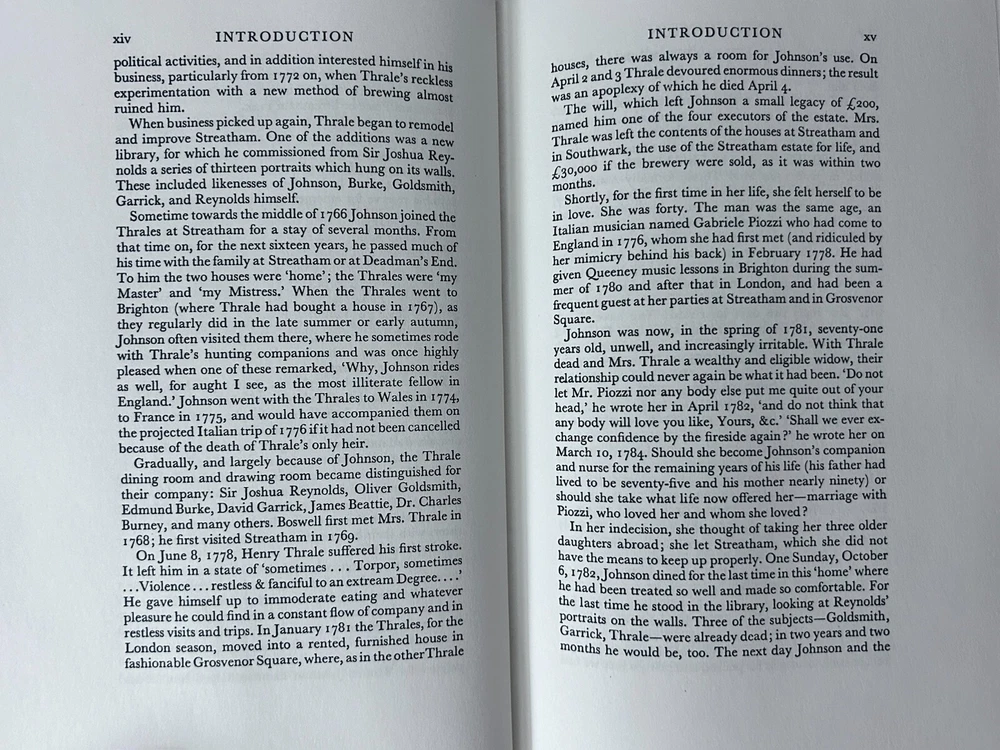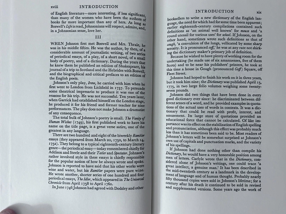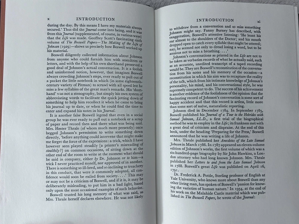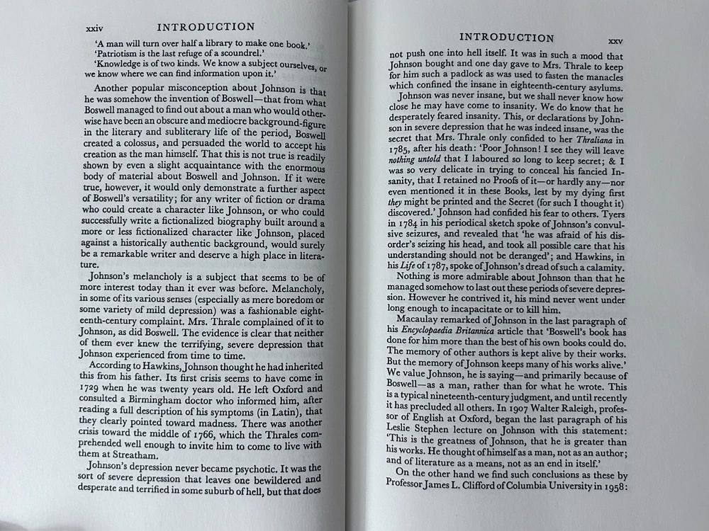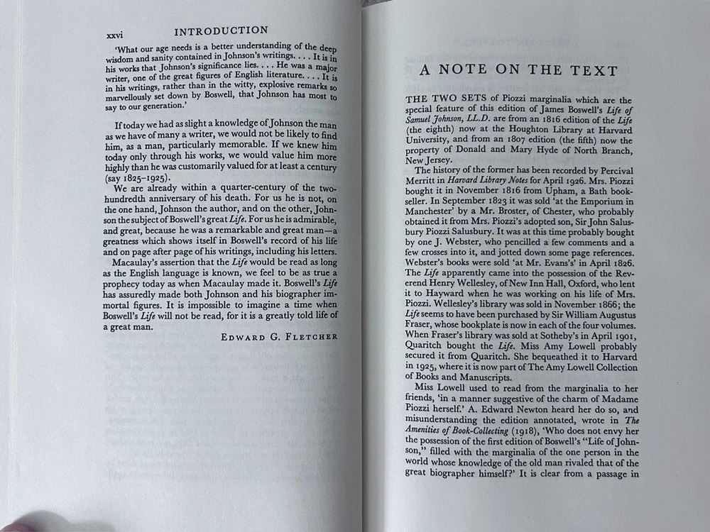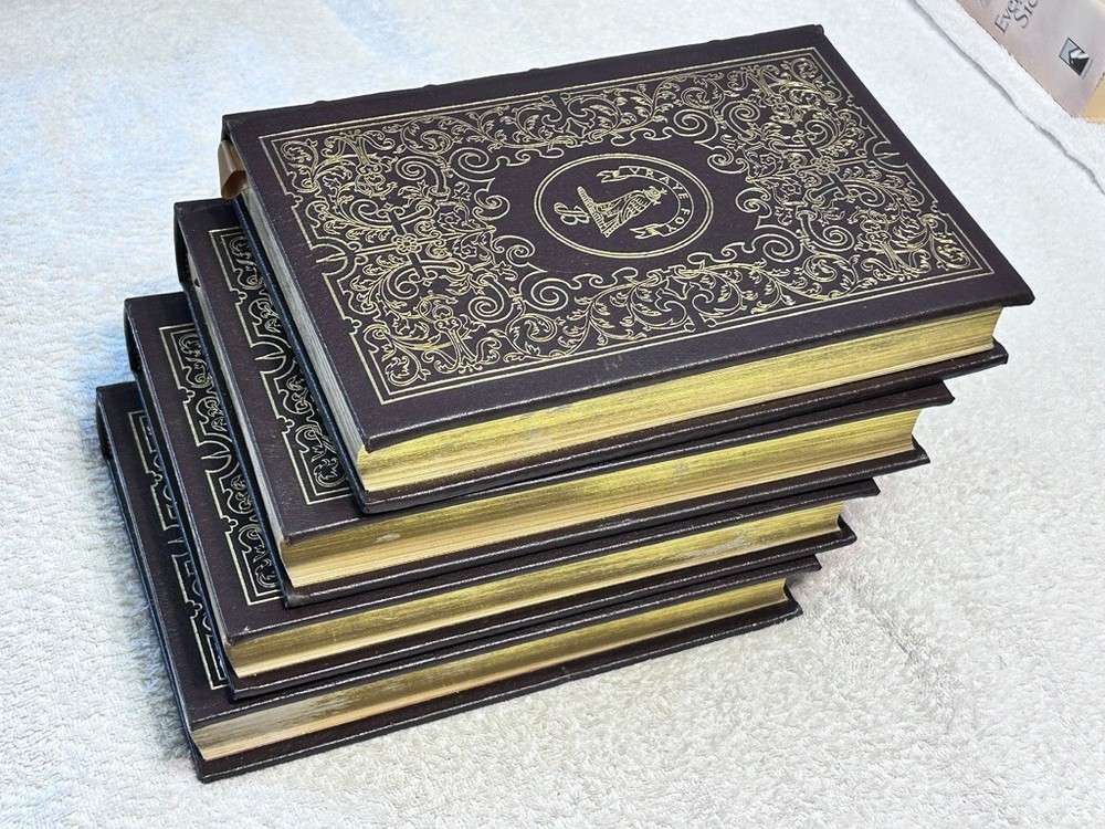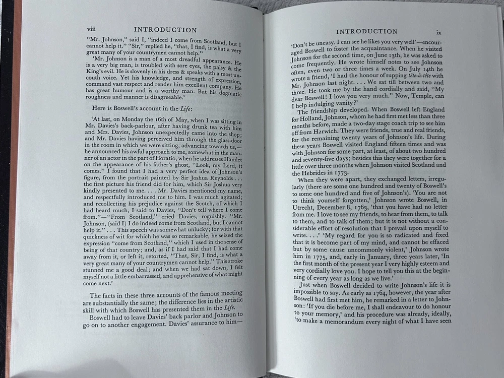 Features of this Easton Press Illustrated Collection include: Fully and tightly bound in genuine leather. 22kt gold accents deeply inlaid on the "hubbed" spine. Heavy duty binding boards enhance the book’s durability. Superbly printed on acid-neutral paper that lasts for generations. Sewn pages — not just glued like ordinary books. Handsome moiré endpages and a satin-ribbon page marker. Gilded page ends. Printed and bound in the USA using imported materials. Rigorous inspection at every stage ensures adherence to our exacting standards. Superb craftsmanship and commitment to quality. These Easton Press editions are printed on sturdy, acid-neutral paper specially milled for this edition that conforms to all guidelines established for permanence and durability by the Council of Library Resources and the American National Standards Institute. James Boswell, The Life of Samuel Johnson LL.D. Volume I, II & III and James Boswell, Tour to the Hebrides With Samuel Johnson LL.D. Easton Press, Norwalk CT 1993. James Boswell "The Life of Samuel Johnson" Full genuine leather. Howard Pyle (illustrator). Limited Edition. With marginal comments and markings from two copies annotated by Hester Lynch Thrale Piozzi. Prepared for publication with an introduction by Edward G Fletcher. Uniform brown leather bindings, distinct cover designs with decorations, frontispiece portrait in full color. This collection is now out of print. A complete matching set of four volumes. About Samuel Johnson Johnson, was an English writer who made lasting contributions to English literature as a poet, essayist, moralist, literary critic, biographer, editor and lexicographer. He was a devout Anglican and a generous philanthropist. Politically, he was a committed Tory. The Oxford Dictionary of National Biography describes Johnson as "arguably the most distinguished man of letters in English history". He is also the subject of James Boswell's The Life of Samuel Johnson, described by Walter Jackson Bate as "the most famous single work of biographical art in the whole of literature". Born in Lichfield, Staffordshire, Johnson attended Pembroke College, Oxford, for just over a year, but a lack of funds forced him to leave. After working as a teacher, he moved to London, where he began to write for The Gentleman's Magazine. His early works include the biography Life of Mr Richard Savage, the poems London and The Vanity of Human Wishes, and the play Irene. About James Boswell James Boswell, 9th Laird of Auchinleck (/ˈbɒzwɛl, -wəl/; 29 October 1740 – 19 May 1795), was a Scottish biographer and diarist, born in Edinburgh. He is best known for the biography he wrote of his friend and contemporary, the English literary figure Samuel Johnson, which is commonly said to be the greatest biography written in the English language. Boswell's surname has passed into the English language as a term (Boswell, Boswellian, Boswellism) for a constant companion and observer, especially one who records those observations in print. In "A Scandal in Bohemia", Sir Arthur Conan Doyle's character Sherlock Holmes affectionately says of Dr. Watson, who narrates the tales, "I am lost without my Boswell." Features Includes all the classic Easton Press qualities: * Premium Leather * Silk Moire Endleaves * Distinctive Cover Design * Hubbed Spine, Accented in Real 22KT Gold * Satin Ribbon Page Marker * Gilded Page Edges * Long-lasting, High Quality Acid-neutral Paper * Smyth-sewn Pages for Strength and Durability * Beautiful Illustrations