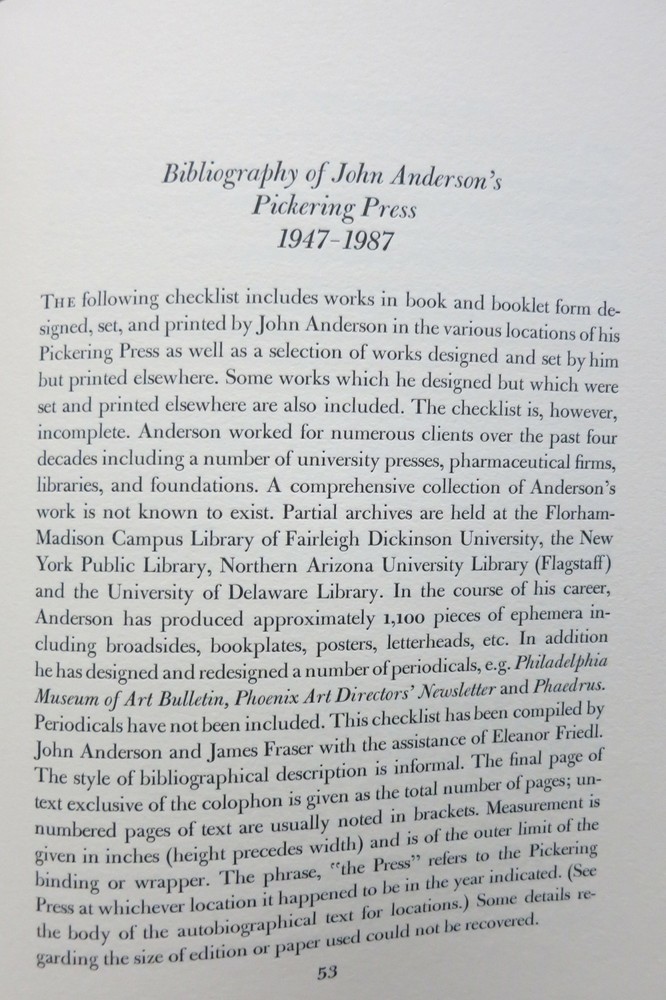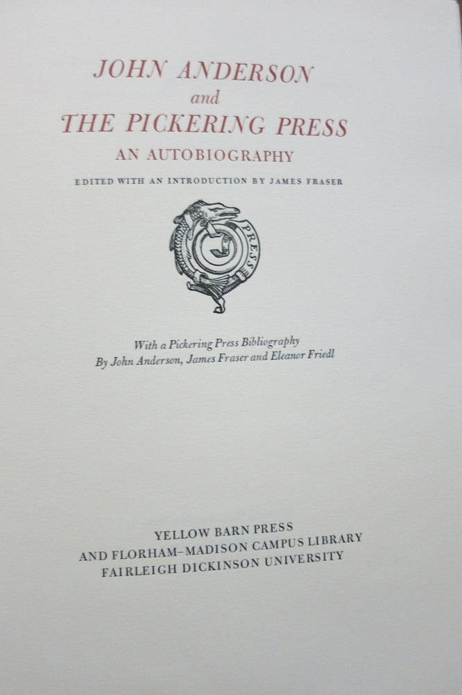 JOHN ANDERSON AND THE PICKERING PRESS, AN AUTOBIOGRAPHY Author: Anderson, John, James Fraser and Eleanor Friedl Title: JOHN ANDERSON AND THE PICKERING PRESS, AN AUTOBIOGRAPHY Publication: Council Bluffs, IA: Yellow Barn Press and Fairleigh Dickinson University, (1995) Edition: No. 95 of1 50 copies Description: Council Bluffs, IA: Yellow Barn Press and Fairleigh Dickinson University, (1995). No. 95 of1 50 copies. Quarto. x, 76p. + 22 pages of facsimiles of the press' work. With a bibliography of the press. Bound in tan linen with leather spine label gilt and housed in a slipcase. Fine. Item #22319 Yellow Barn Press Bibliography B26. Seller ID: 22319 Subject: Private Presses First Folio Paris, TN Established in 1980, First Folio is a purveyor of fine and rare books in many fields. Our major holdings include fine bindings and illustrated books, but we also handle a wide range of subjects emphasizing quality and condition. We are members of the Antiquarian Booksellers Association of America (A.B.A.A.) and the International League of Antiquarian Booksellers (I.L.A.B.). We subscribe to and comply with their codes of ethics. Guarantee All items may be returned within 30 days, with a full refund including shipping costs if an item arrives misdescribed or damaged. Shipping Expedited and international shipping is available, please contact us for a price quote BEFORE placing an order. We are happy to combine shipping on multiple items. Payment We prefer PayPal. Feedback We leave feedback after receiving buyer's feedback. If you are unhappy with your order for any reason, please contact us, and we will resolve the problem! This listing was created by Bibliopolis.