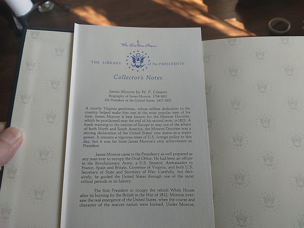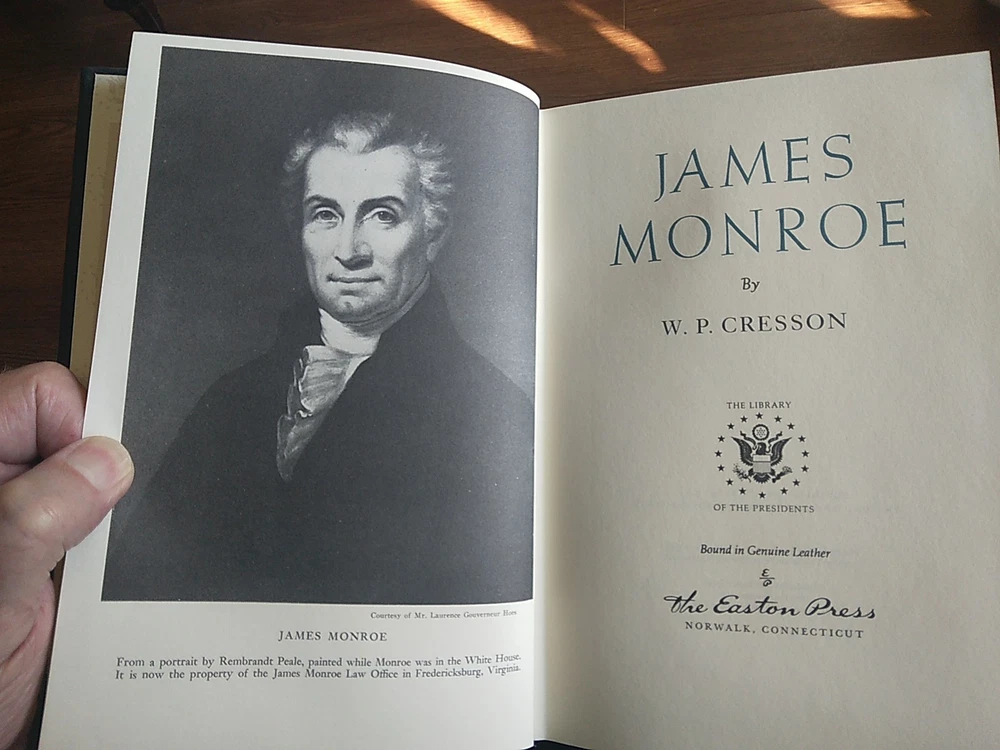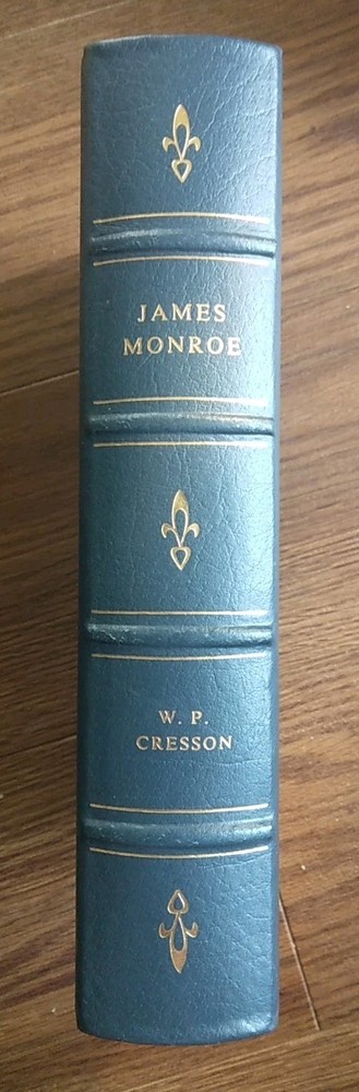 The product is a collector's edition leather-bound book titled "James Monroe" by W.P. Cresson, published by Easton Press in 1986. This book is part of the Library of the Presidents series, making it a valuable addition to any collection focusing on American history. With special attributes such as gilt detailing and being ex libris, this original printing showcases the craftsmanship and scholarship of both the author and publisher. Beautiful book, like new.