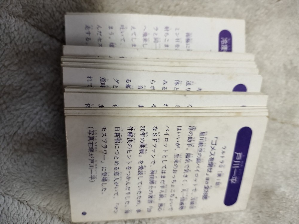 This is a set of 100 Ultraman cards sold in Japan over 50years ago. Nowadays, there are few left in Japan and it is very difficult to obtain. Powerful movie scenes are contained in 100 cards. Card siz...