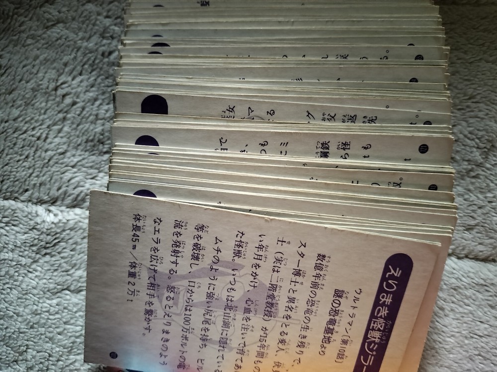 This is a set of 100 Ultraman cards sold in Japan over 50years ago. Nowadays, there are few left in Japan and it is very difficult to obtain. Powerful movie scenes are contained in 100 cards. Card siz...