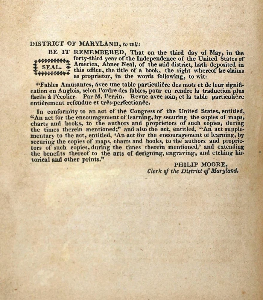 Leather. 12mo. Chez A. Neal de l'imprimerie de J.D. Toy, Baltimore, MD 1823. 180 pgs. Second Baltimore Edition. Text in French. Bound in contemporary brown calf leather. with titling and illustrations in gilt and black. Boards have shelf-wear present to the extremities (light rubbing and soiling present to the boards). No ownership marks present. Foxing present. Text is free of marks. Hinges hanging on. For Anglo-American juveniles, Perrin's Fables in its day, was the standard French primer for more than half a century, since its first London printing in 1771. This 1823 Baltimore edition is quite rare. Jean-Baptiste Perrin 1823 Fables Amusantes Avec Une Table Générale French Primer Jean-Baptiste Perrin 1823 Fables Amusantes Avec Une Table Générale French Primer Description Up For Sale Today is Fables Amusantes Avec Une Table Générale Des Mots Et De Leur Signification En Anglois Selon L'ordre Des Fables Pour En Rendre La Traduction Plus Faciles À L'écolier by M. [Jean-Baptiste] Perrin Leather. 12mo. Chez A. Neal de l'imprimerie de J.D. Toy, Baltimore, MD 1823. 180 pgs. Second Baltimore Edition. Text in French. Bound in contemporary brown calf leather. with titling and illustrations in gilt and black. Boards have shelf-wear present to the extremities (light rubbing and soiling present to the boards). No ownership marks present. Foxing present. Text is free of marks. Hinges hanging on. For Anglo-American juveniles, Perrin's Fables in its day, was the standard French primer for more than half a century, since its first London printing in 1771. This 1823 Baltimore edition is quite rare. OUR MISSION STATEMENT: Our goal is to provide the best books for the lowest prices. We understand that you have more choices than ever to buy books, so we strive to provide the best service, accurate descriptions, the cheapest shipping and the best customer service in the realm of bookselling. Thank you for visiting this listing and we hope to see you again soon! Book formats and corresponding sizes Name Abbreviations Leaves Pages Approximate cover size (width × height) inches cm folio 2º or fo 2 4 12 × 19 30.5 × 48 quarto 4º or 4to 4 8 9½ × 12 24 × 30.5 octavo 8º or 8vo 8 16 6 × 9 15 × 23 duodecimo or twelvemo 12º or 12mo 12 24 5 × 7⅜ 12.5 × 19 sextodecimo or sixteenmo 16º or 16mo 16 32 4 × 6¾ 10 × 17 octodecimo or eighteenmo 18º or 18mo 18 36 4 × 6½ 10 × 16.5 trigesimo-secundo or thirty-twomo 32º or 32mo 32 64 3½ × 5½ 9 × 14 quadragesimo-octavo or forty-eightmo 48º or 48mo 48 96 2½ × 4 6.5 × 10 sexagesimo-quarto or sixty-fourmo 64º or 64mo 64 128 2 × 3 5 × 7.5 ALL ITEMS ARE DESCRIBED TO THE BEST OF MY ABILITY! PLEASE CHECK ALL THE PHOTOS BEFORE BIDDING! ALL ITEMS ARE WRAPPED IN 2 LAYERS OF BUBBLE WRAP AND THEN PLACED INTO A CUSTOM FITTED CARDBOARD MAILER. IF YOU WIN A LARGE NUMBER OF BOOKS OR A SET THE ITEMS WILL BE SHIPPED IN A STURDY BOX. IF YOU DO WIN MULTIPLE ITEMS PLEASE DO NOT PAY FOR THEM INDIVIDUALLY! PAYMENT IS DUE WITHIN SEVEN (7) DAYS OF THE INVOICE! Import duties, taxes and charges are not included in the item price. These charges are the buyer's responsibility. Please check with your country's customs office to determine what these additional costs will be prior to bidding/buying. These charges are typically collected by the delivering freight (shipping) company or when you pick the item up. We do not mark merchandise values below value or mark items as "gifts" as US and International government regulations prohibit such behavior. (This is a felony in the United States) FREE DOMESTIC (MEDIA MAIL) FREIGHT ON ALL ITEMS! Create your brand with Auctiva's Customizable Templates. Attention Sellers - Get Templates Image Hosting, Scheduling at Auctiva.com. Track Page Views With Auctiva's FREE Counter
