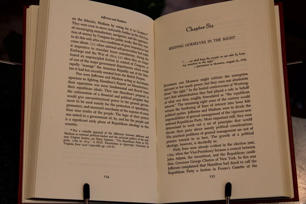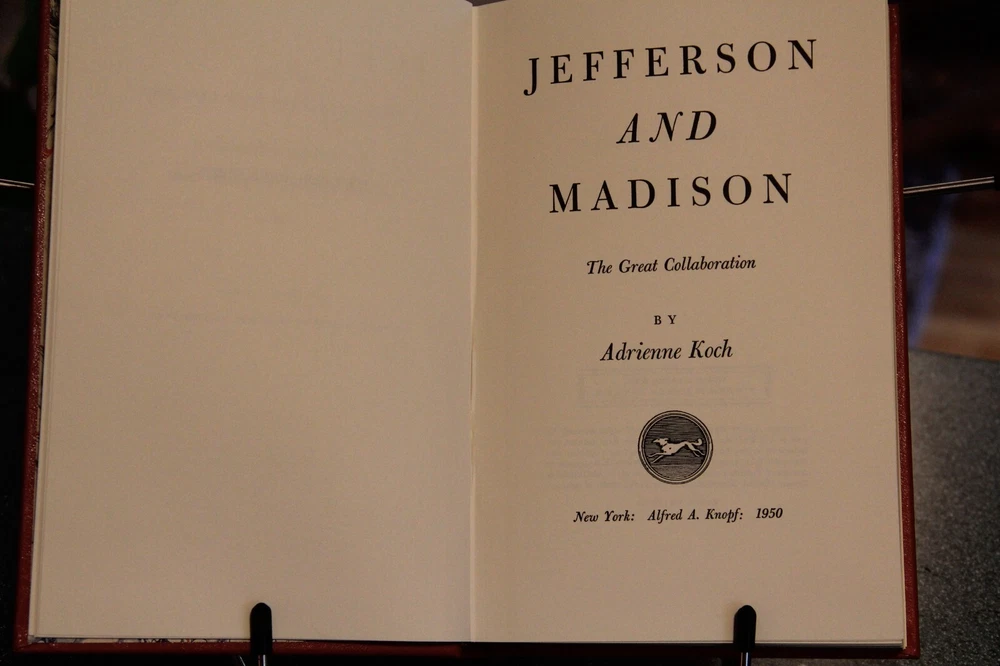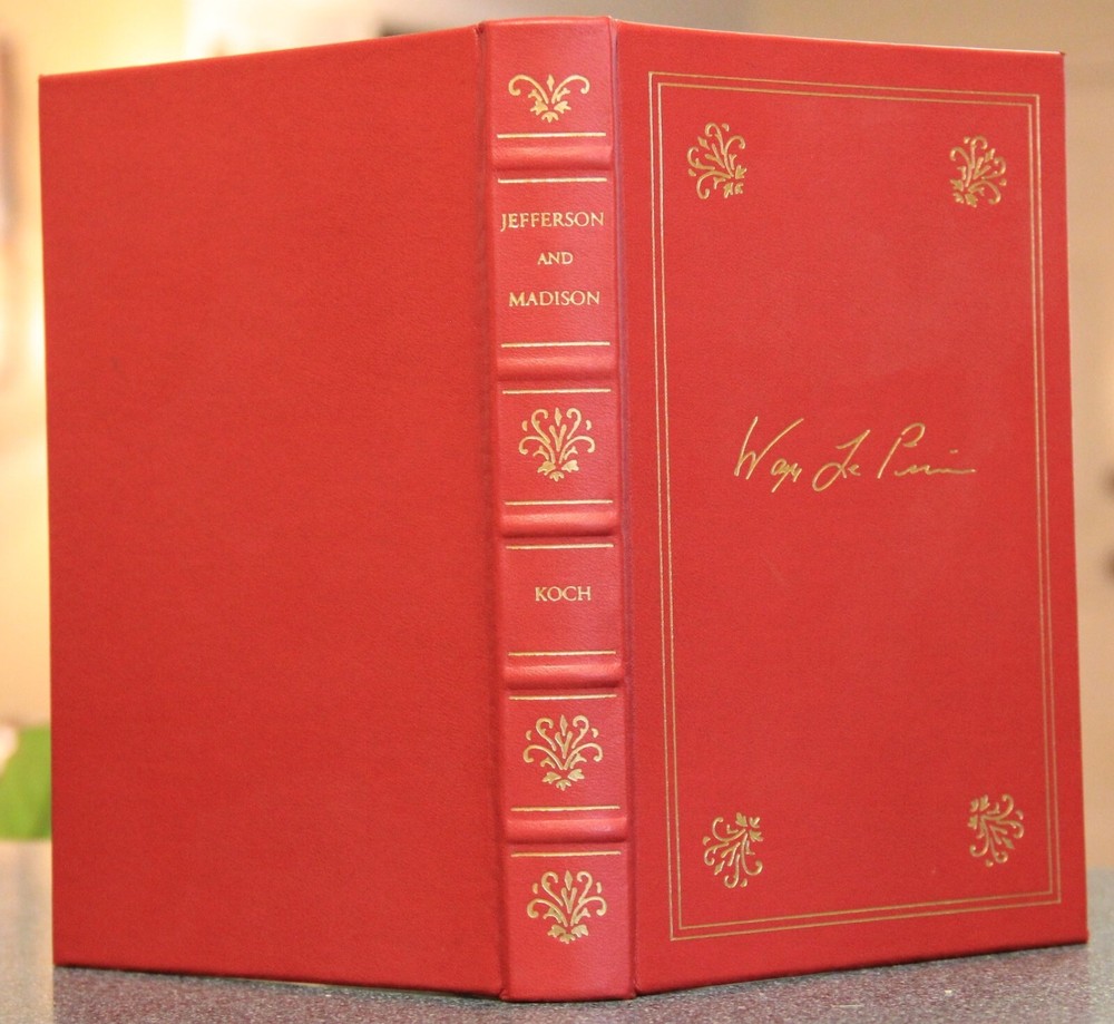 "Jefferson and Madison: The Great Collaboration," by Adrienne Koch, published in 2000, privately printed for the members of The Library of American Freedoms. With an introduction by Wayne LaPierre. Film was prepared from an original 1950 edition. B ound in leather, with raised bands on the spine, marbled endleaves, and gilded page edges. The spines were brass-die stamped in 22-karat gold, and cover stampings and design of the edition were by Selma Ordewer. 294 pages, with index. I pack carefully and ship promptly, free via USPS Media Mail.