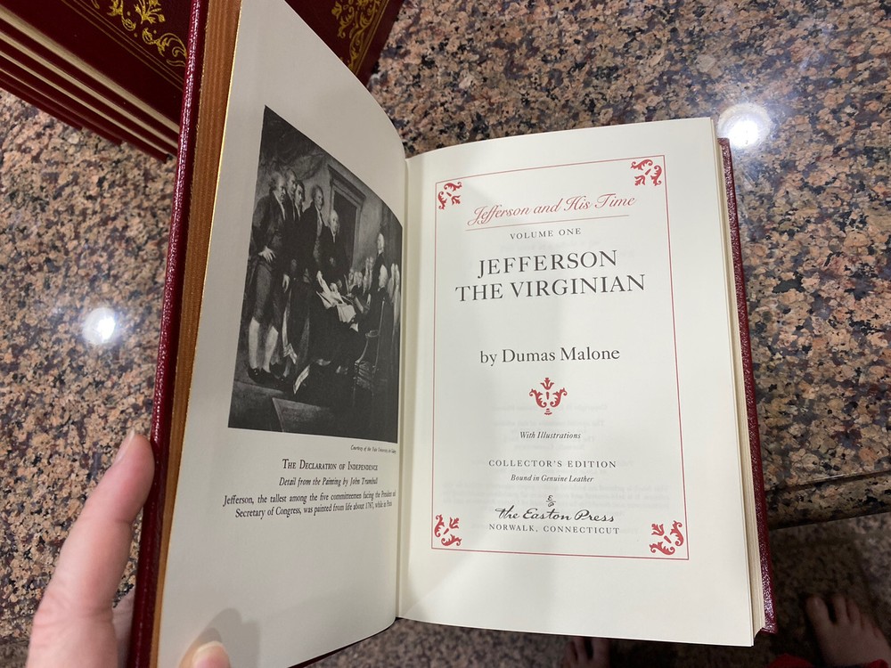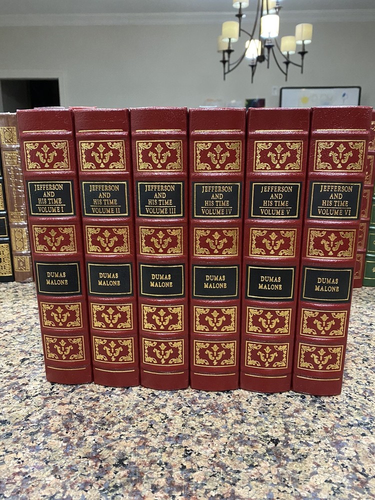 Jefferson and His Time by Dumas Malone Easton Press Six Volume Collection Includes Easton Press' many, fine quality features 22K Gold gilding on the leather cover Gilded pages Hubbed spine Decorative end papers Acid neutral archival paper Sewn-in satin bookmark