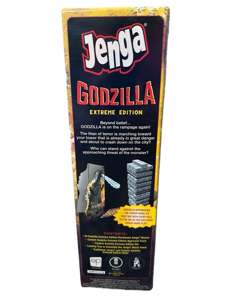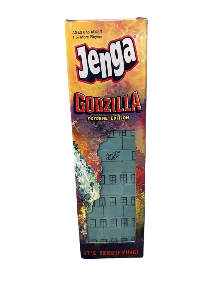 Collectible Jenga edition featuring classic kaiju monster Godzilla on a rampage to destroy the tower Godzilla moves with each roll of the die, so players must quickly build the Jenga tower with a steady hand, some strategy, and luck Great for any Godzilla fan and collector - show your love for the king of the monsters with this collectible game Includes 54 hardwood Jenga blocks, 1 die, game board, collectible Godzilla loading tray, and rules 1+ Players | Ages 8+ | 5-15 Min Play Time Age Range Description Teen, Adult Brand Name USAOPOLY Included Components Hardwood Jenga® Blocks (54), Custom Godzilla Die, Loading Tray to Assemble the Jenga® Block Tower, Rules, Custom Godzilla Approach Track Model Year 2020 Sub Brand Godzilla Item Type Name Jenga UPC 700304153517 Customer Reviews 4.8 out of 5 stars 495Reviews Best Sellers Rank #39,874 in Toys & Games (See Top 100 in Toys & Games) #68 in Stacking Games ASIN B08466GD8N Item Height 3.13 inches Manufacturer USAopoly