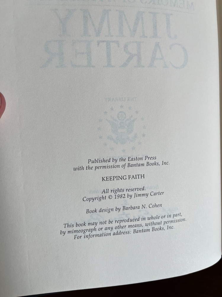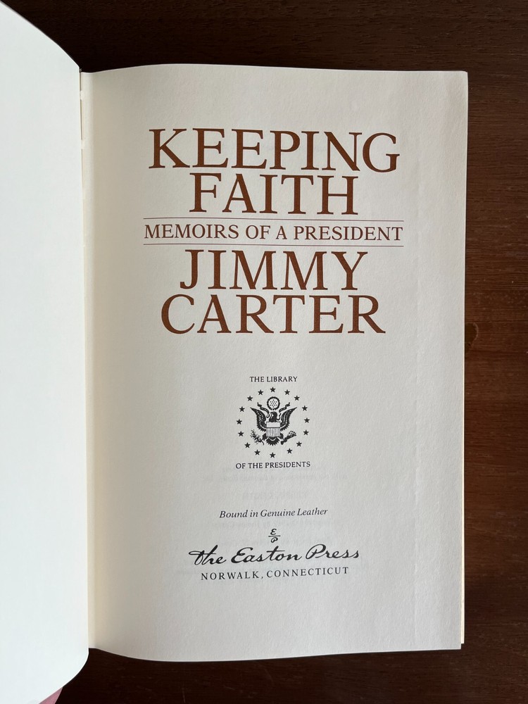 James (Jimmy) Earl Carter is truly a renaissance man in that he has been a nuclear submarine officer, a peanut farmer/businessman, state Senator, Governor, President of the United States, painter, woodworker, professor, and Sunday school teacher. His life and Presidency is one to be studied along with the many works he has accomplished through his 90 plus years. Keeping Faith gives President Carter's account of the trials that come with the oval office. Carter further explains how holding onto his faith allowed him to push through the ebbs and flows of the Presidency. Easton Press is a premier publisher of collectable books and regularly increases in value. Disclaimer: Any defects known to us are presented in the pictures.