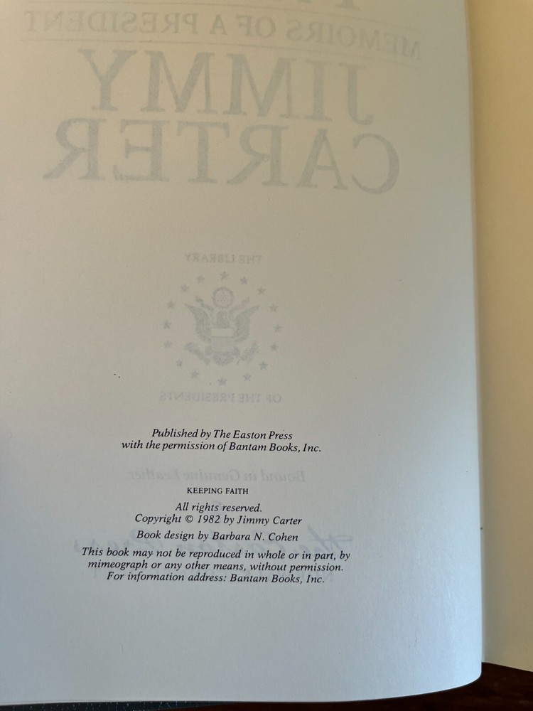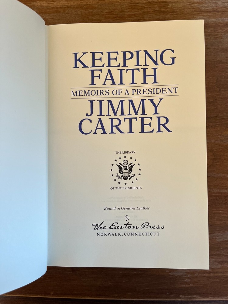 James (Jimmy) Earl Carter is truly a renaissance man in that he has been a nuclear submarine officer, a peanut farmer/businessman, state Senator, Governor, President of the United States, painter, woodworker, professor, and Sunday school teacher. His life and Presidency is one to be studied along with the many works he has accomplished through his 90 plus years. Keeping Faith gives President Carter's account of the trials that come with the oval office. Carter further explains how holding onto his faith allowed him to push through the ebbs and flows of the Presidency. Easton Press is a premier publisher of collectable books and regularly increases in value. Disclaimer: Any defects known to us are presented in the pictures.