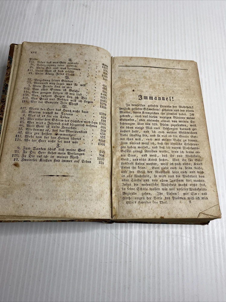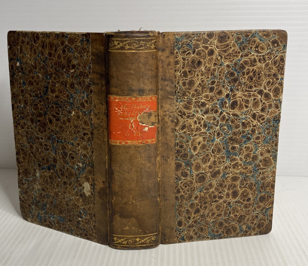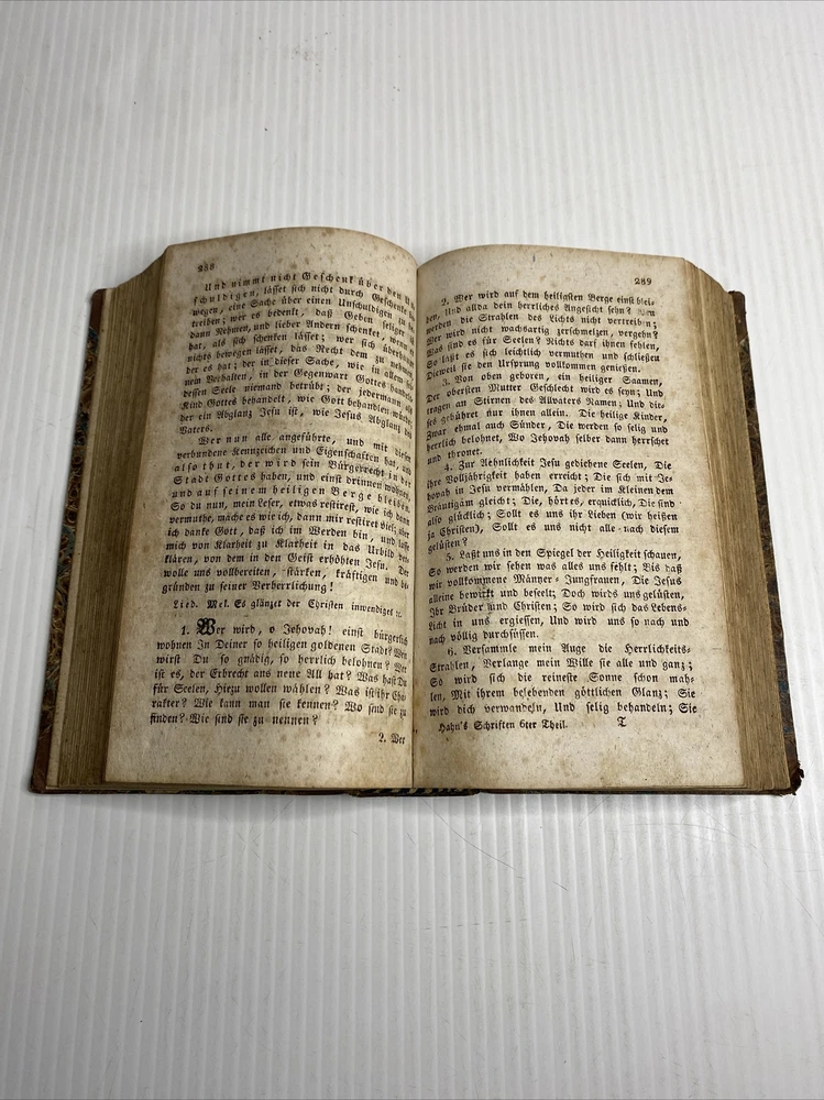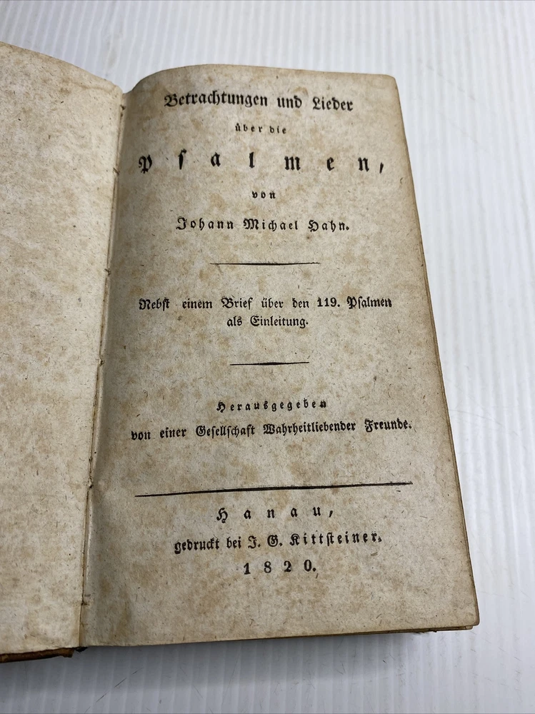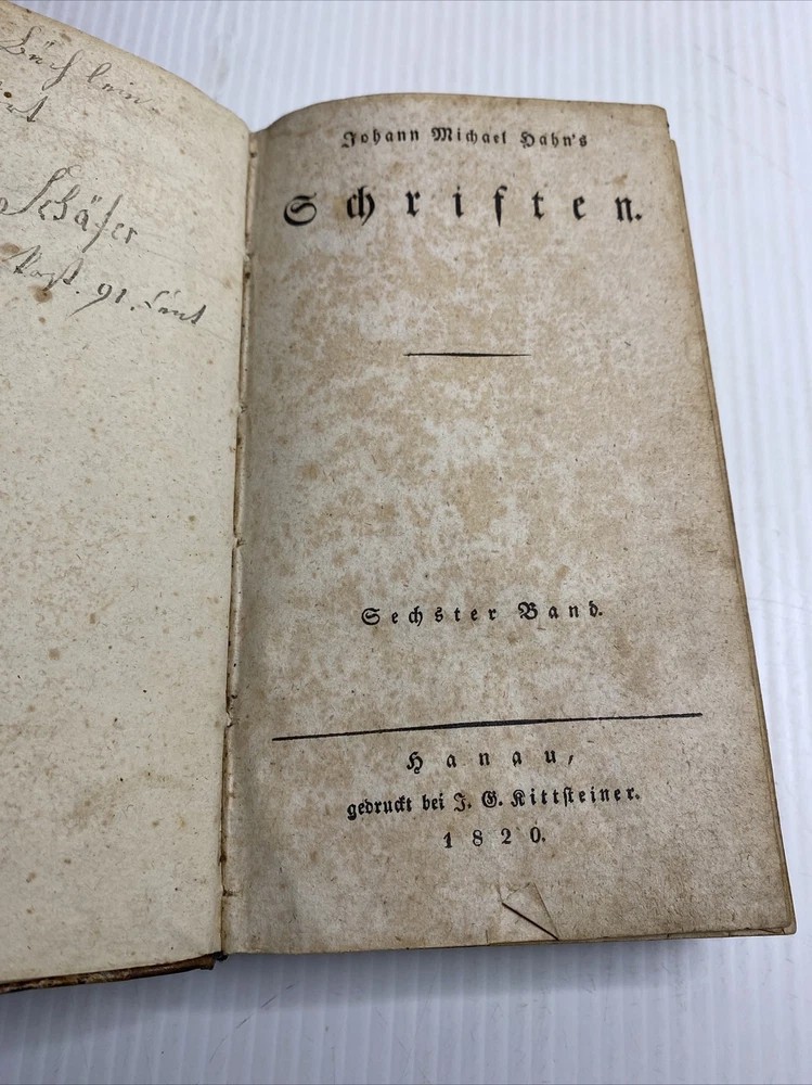 This antique book by Johann Michael Hahn, titled Schriften Reflections And Songs Sixth Volume 1820, is a rare find for collectors of German literature. The beautiful cover and the leather binding add to the authenticity of the book, and it is a testament to the skill of the craftsmen of that era. The book covers religious topics, and the author's insights are profound and timeless. It is a must-have addition to any collection of antiquarian books. Please see pictures for an assessment of condition. Stains, folded pages and small tears are present. Cover shows wear. Also, writing is present inside of the front cover with a date of 1821.