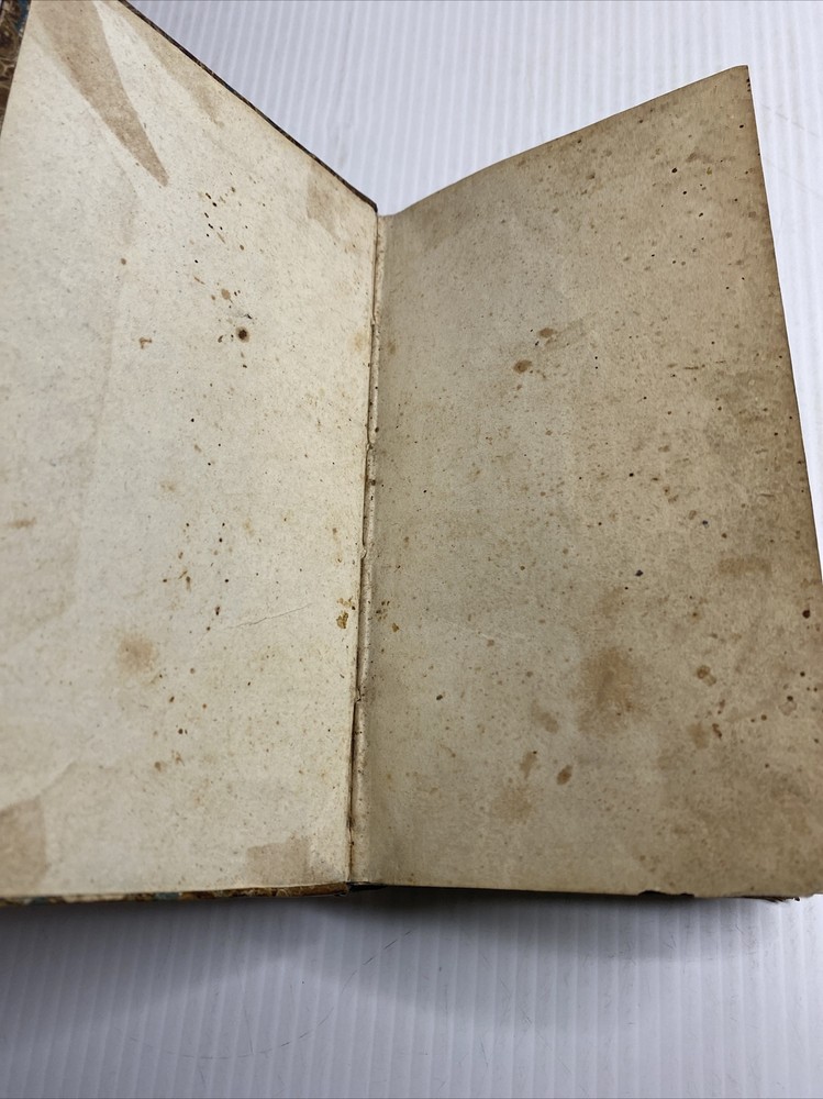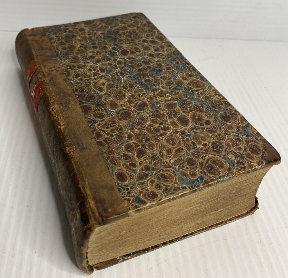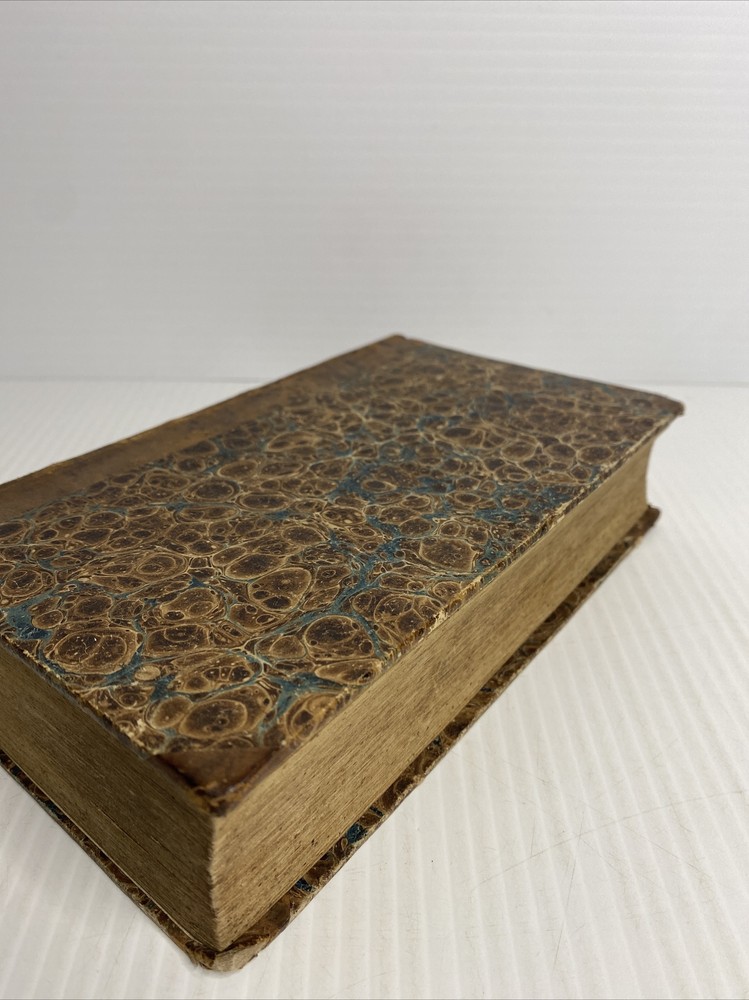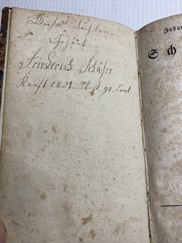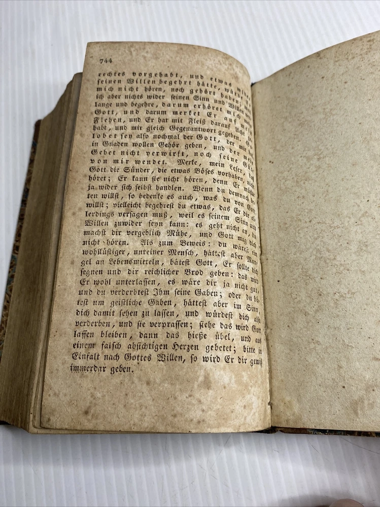 This antique book by Johann Michael Hahn, titled Schriften Reflections And Songs Sixth Volume 1820, is a rare find for collectors of German literature. The beautiful cover and the leather binding add to the authenticity of the book, and it is a testament to the skill of the craftsmen of that era. The book covers religious topics, and the author's insights are profound and timeless. It is a must-have addition to any collection of antiquarian books. Please see pictures for an assessment of condition. Stains, folded pages and small tears are present. Cover shows wear. Also, writing is present inside of the front cover with a date of 1821.