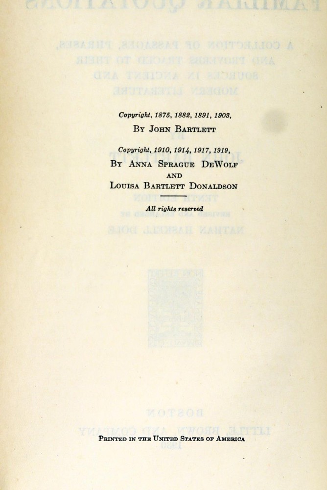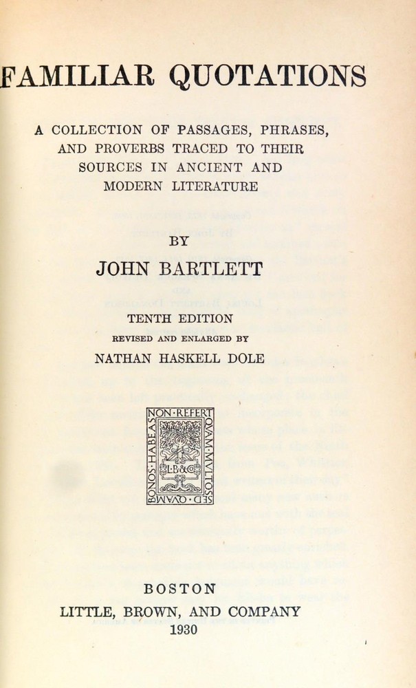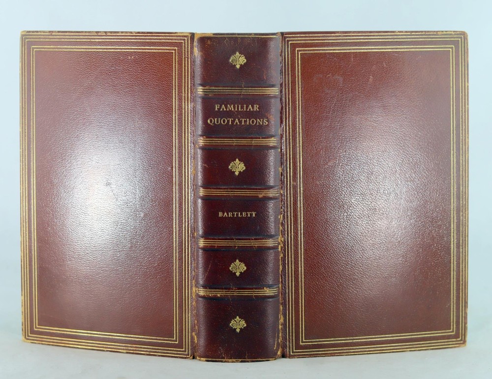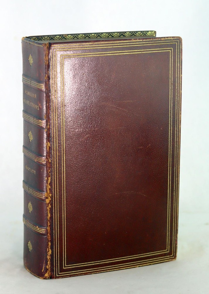 Leather. 8vo. Published by Little, Brown and Co., Boston, MA 1930. 1454 pages. 10th Edition. Bound in full brown leather with gilt rule and designs present to the boards and stamped gilt titles and raised bands present to the spine. Boards have light shelf-wear present. No ownership marks present. Text is clean and free of marks. Binding tight and solid. John Bartlett's timeless collection of quotations from many of the finest luminaries of English prose and poetry are presented here. The book begins with a presentation of the King James Bible, beginning with the Old Testament. Many of the most inspiring and memorable verses from across the Biblical canon are present. This is followed by the New Testament, with a number of the most evocative and spiritually rich gospel quotations listed. After the Bible comes Shakespeare's plays - listing each play in turn, Bartlett presents the finest lines from each. The great wisdom and expression for which William Shakespeare is renowned finds ample demonstration, with tragedies such as Macbeth and comedies such as Twelfth Night among the plays Bartlett draws upon. John Bartlett (June 14, 1820 – December 3, 1905) was an American writer and publisher whose best known work, Bartlett's Familiar Quotations, has been continually revised and reissued for a century after his death. John Bartlett 1930 Familiar Quotations Fine Green Morocco Leather Binding John Bartlett 1930 Familiar Quotations Fine Green Morocco Leather Binding Click images to enlarge Description Up For Sale Today is Familiar Quotations A Collection of Passages, Phrases and Proverbs Traced to their Sources in Ancient and Modern Literature by John Bartlett Revised and Enlarged by Nathan Haskell Dole Leather. 8vo. Published by Little, Brown and Co., Boston, MA 1930. 1454 pages. 10th Edition. Bound in full brown leather with gilt rule and designs present to the boards and stamped gilt titles and raised bands present to the spine. Boards have light shelf-wear present. No ownership marks present. Text is clean and free of marks. Binding tight and solid. John Bartlett's timeless collection of quotations from many of the finest luminaries of English prose and poetry are presented here. The book begins with a presentation of the King James Bible, beginning with the Old Testament. Many of the most inspiring and memorable verses from across the Biblical canon are present. This is followed by the New Testament, with a number of the most evocative and spiritually rich gospel quotations listed. After the Bible comes Shakespeare's plays - listing each play in turn, Bartlett presents the finest lines from each. The great wisdom and expression for which William Shakespeare is renowned finds ample demonstration, with tragedies such as Macbeth and comedies such as Twelfth Night among the plays Bartlett draws upon. FROM WIKIPEDIA: John Bartlett (June 14, 1820 – December 3, 1905) was an American writer and publisher whose best known work, Bartlett's Familiar Quotations, has been continually revised and reissued for a century after his death. Bartlett was born in Plymouth, Massachusetts, to William Bartlett and Susan Thacher. His father was a descendant of Mayflower Pilgrims Love Brewster, a founder of the town of Bridgewater, Massachusetts; Elder William Brewster, the Pilgrim colonist leader and spiritual elder of the Plymouth Colony; and John Alden, who was hired as a cooper in Southampton, England, just before the voyage to America and who along with the Brewsters were signers of the Mayflower Compact. His mother was a direct descendant of Anthony and Elizabeth Thacher who were the sole survivors of a terrible shipwreck on August 14, 1635 in which twenty one passengers including their four children were drowned. Thacher Island, a small island off Cape Ann on the Massachusetts coast in the United States is named after them. A very bright boy, he was reading at age three and had read the entire Bible by nine. He finished school at age sixteen and went to Cambridge, Massachusetts, where he worked for the University Bookstore that served Harvard. By age twenty-nine he owned the store. Known for his memory for quotations and trivia, "Ask John Bartlett" became a byword in the community when someone was stumped. He began keeping a commonplace book of quotations to answer queries and in 1855 privately printed the first edition of his Familiar Quotations. That edition of 258 pages contained entries from 169 authors. One-third of the book was quotations from the Bible and from the works of William Shakespeare, most of the balance being lines from the great English poets. Bartlett sold the bookstore in 1862 to become a paymaster in the United States Navy during the Civil War. He served on the South Atlantic station, returning to Boston in 1863 to join the firm Little, Brown and Company. That same year, Little, Brown issued the fourth edition of his quotation book. He rose to be the firm's senior partner in 1878 and retired from the firm in 1889. In addition to work on quotations (he oversaw nine editions of his book), he wrote on fishing, and chess, and compiled a massive concordance of Shakespeare, published in 1894, that is still the standard work of its kind. The concordance, which Bartlett estimated consumed 16,000 hours of his time, was compiled with his wife Hannah, the daughter of Sidney Willard, a professor of Hebrew at Harvard, and the granddaughter of Joseph Willard, president of Harvard. He died in Cambridge, Massachusetts aged 85 and is buried at Mount Auburn Cemetery in Cambridge, Middlesex County, Massachusetts. OUR MISSION STATEMENT: Our goal is to provide the best books for the lowest prices. We understand that you have more choices than ever to buy books, so we strive to provide the best service, accurate descriptions, the cheapest shipping and the best customer service in the realm of bookselling. Thank you for visiting this listing and we hope to see you again soon! Book formats and corresponding 
