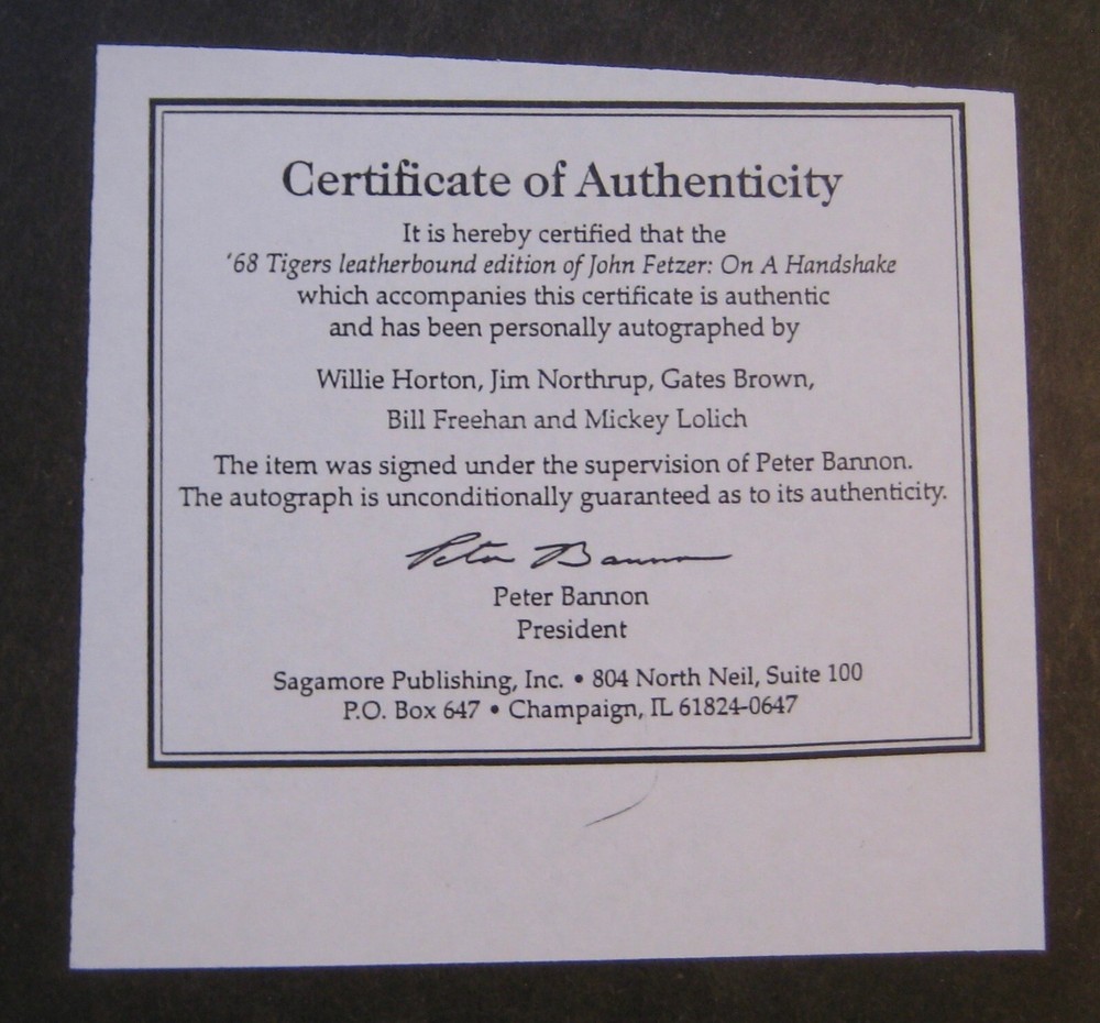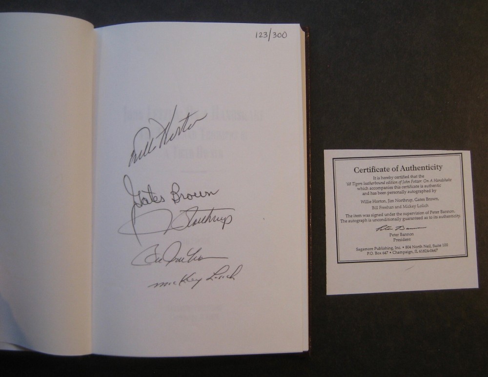 We are offering for sale the following book titled John Fetzer On A Handshake: The Times & Triumphs of a Tiger Owner by Dan Ewald with foreword by Al Kaline. 189-page hardcover leather bound book is special limited edition numbered 123/300 and is signed with a COA by former Detroit Tigers Willie Horton, Jim Northrup, Gates Brown, Bill Freehan and Mickey Lolich. Book is in excellent condition(see pictures). Book will be securely shipped inside bubble wrap or padded envelope. Shipping and handling to the United States will be $6.00US sent USPS Media Mail. Thanks for looking and good luck. Visit My eBay Store Add me to your Favorite Sellers