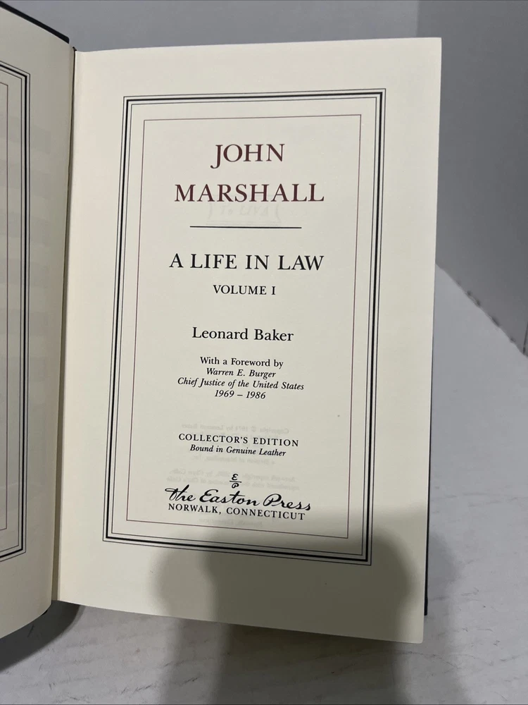 This biography of John Marshall titled "A Life in Law" by Leonard Baker is a must-have for collectors and history enthusiasts alike. Published by Easton Press, this original leather-bound book is a part of their collector's edition series. The book is in English and belongs to the biography and autobiography genre. The book offers a detailed account of Marshall's life and career, making it a great addition to any library. It is an original copy and not a facsimile. The book is also not signed or personalized. The book is perfect for those interested in classics and the history of North America.