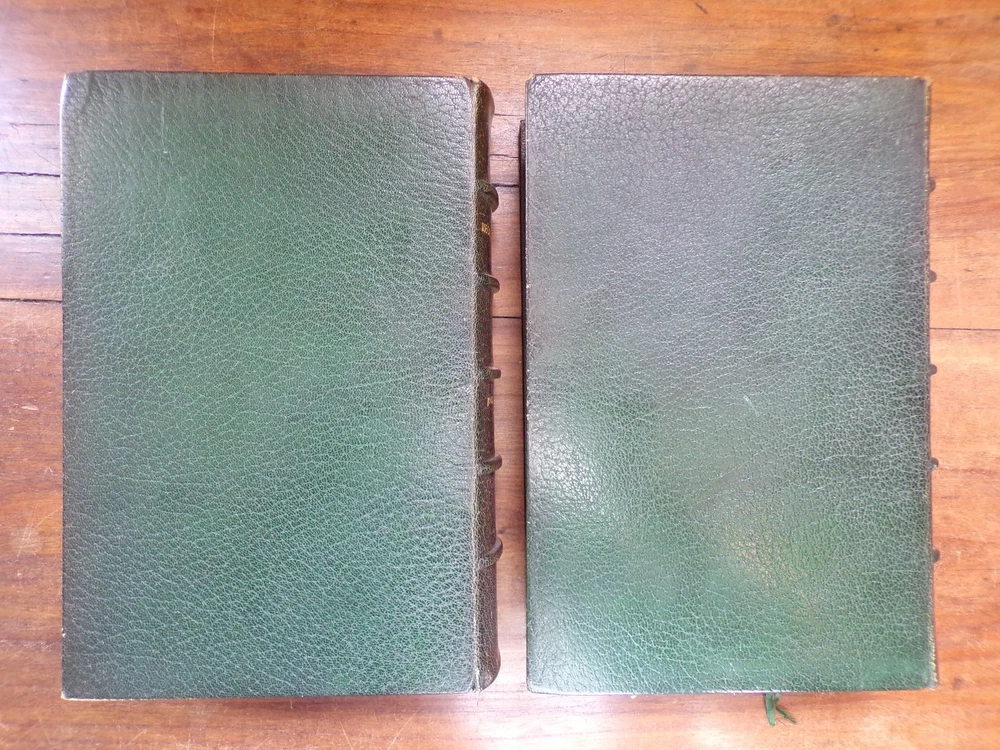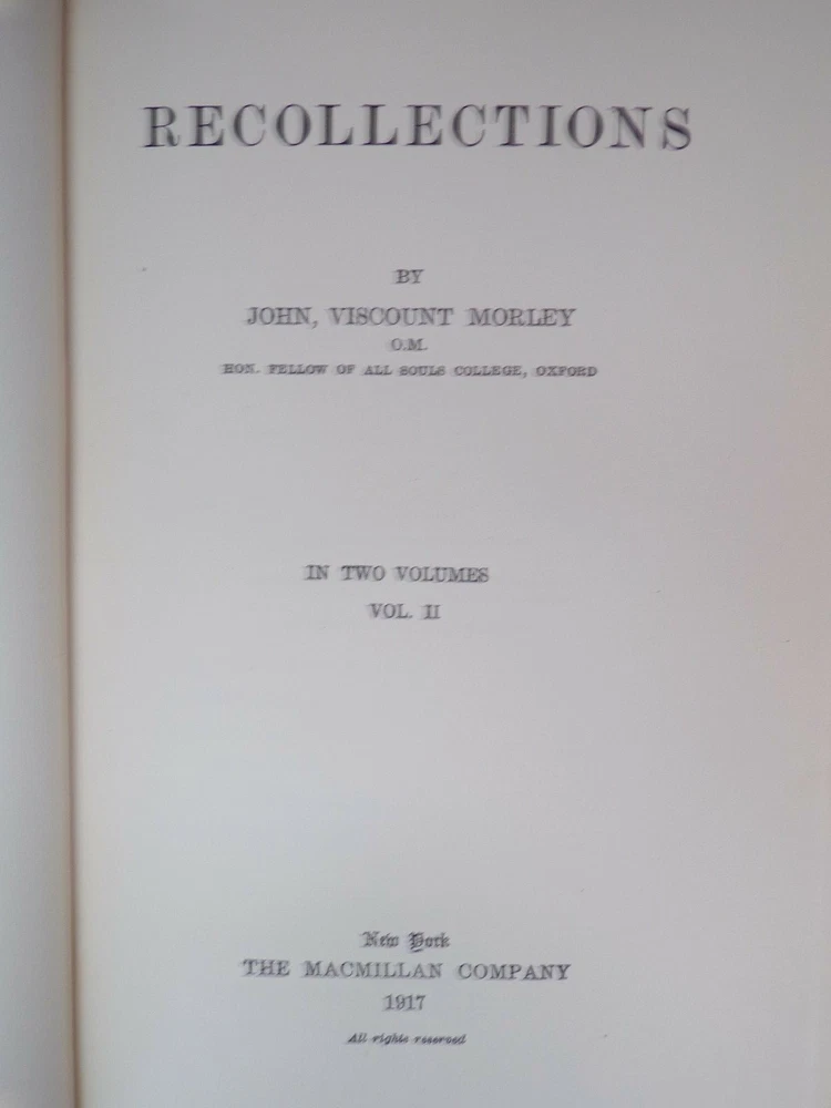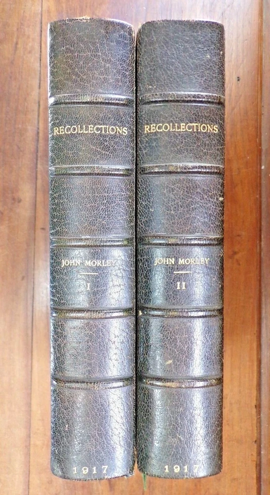 Recollections by John Morley, Vicsount Published by Macmillan (1917) - Hardcover, no Dustjacket, as issued 1st Edition, 2nd Printing Dark Green leather boards, with gold gilt titles and five raised bands on spine. Sewn in green satin bookmarks. Gold gilt top pages edges. Books are in very good condition, with some wear to the covers, especially the corners, edges and spine. Spine is faded to dark brown. In Vol 1 the satin bookmark has come loose and broken in two, but is still included, in Vol 2 it has come loose but is still in one piece and included. A couple of interesting items related to these books; Both have marks indicating G.P. Putnam Sons on bottom inside front cover, and both have marks indicating The Knickerbocker Press on inside back cover. Vol 2 has cellophane, with seal protecting the back free endpaper (no idea why) Strange...