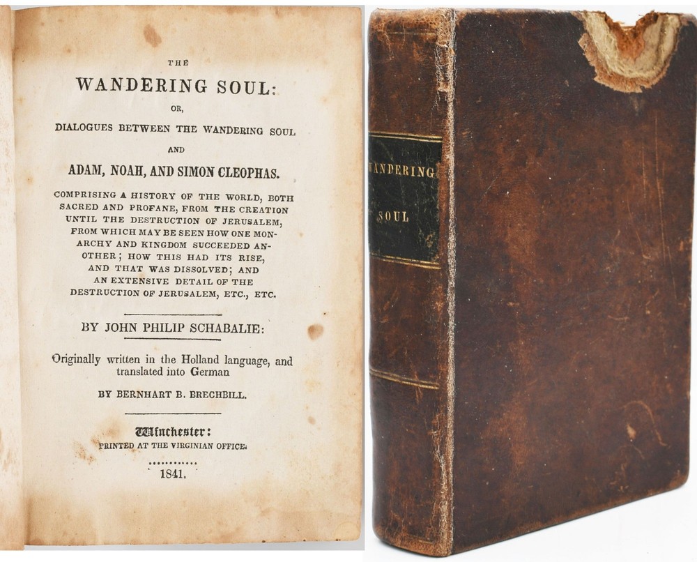 [RELIGION] THE WANDERING SOUL: OR, DIALOGUES BETWEEN THE WANDERING SOUL AND ADAM, NOAH, AND SIMON CLEOPHAS Author: John Philip Schabalie | Bernhart B. Brechbill [Translator] Title: [RELIGION] THE WANDERING SOUL: OR, DIALOGUES BETWEEN THE WANDERING SOUL AND ADAM, NOAH, AND SIMON CLEOPHAS Publication: Winchester: Printed at the Virginian Office, 1841 Description: 8vo.; in the full mottled calf, with a black morocco label; 471 pages, including the Index; there is loss to the leather at the top of the upper board, with a 1” x 2” piece missing right down to the cardboard under the leather (and a small amount right through the cardboard at the very top); a previous owner name (”Rachel Mason”) is pencilled at the top of the front flyleaf.~~Comprising a history of the world, both sacred and profane, from the creation until the destruction of Jerusalem : from which may be seen how one monarchy and kingdom succeeded another : how this had its rise, and that was dissolved : and an extensive detail of the destruction of Jerusalem, etc., etc. ~~This Winchester imprint is uncommon. Good binding. Seller ID: 298348 Black Swan Books Richmond VA We specialize in antiquarian books, classic literature, the Civil War, Viriginiana, travel, art, children's books, and other subject areas, including religion and philosophy . Terms Payment via PayPal is preferred. All orders ship within two [2] business days, Monday through Friday by standard mail, USPS Media Mail. Combined orders and expedited shipping is available. Please contact us for a shipping quote before ordering. All items are guaranteed as listed and described. Any item may be returned within 30 days for any reason in the condition is which they were sent. This listing was created by Bibliopolis.