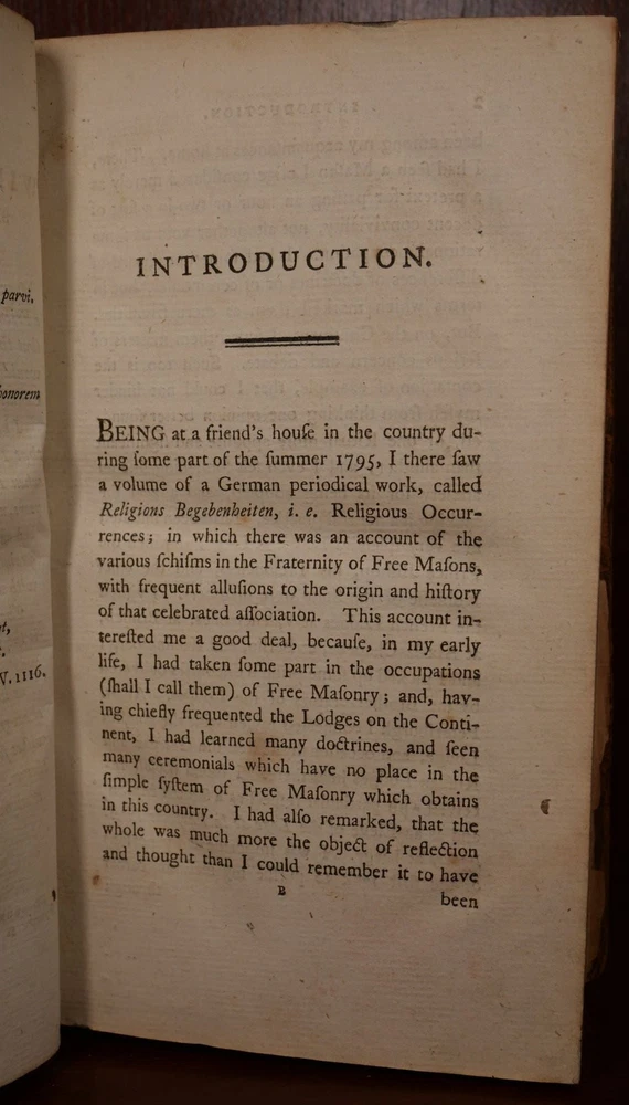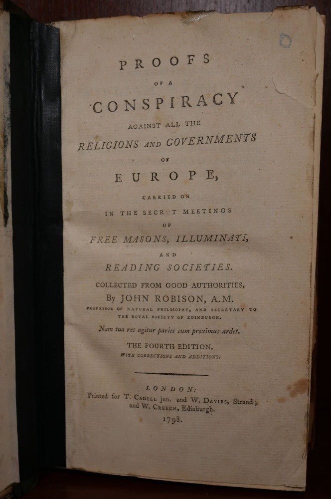 Proofs of a Conspiracy Against All the Religions and Governments of Europe, Carried on in the Secret Meetings of Free Masons, Illuminati, and Reading Societies Author: John Robison Title: Proofs of a Conspiracy Against All the Religions and Governments of Europe, Carried on in the Secret Meetings of Free Masons, Illuminati, and Reading Societies Publication: London: T. Cadell and W. Davies, 1798 Edition: Fourth Edition Description: The fourth edition, as stated on the title page. Book measures approximately 8.5" x 5.25", with 587 numbered pages. The book is in fair condition. Binding is very worn and the spine has an old amateur tape repair holding the rear board - which would otherwise be seperated. Interestingly, the front board is marbled, and the rear board is leather so this must be a married binding. Front hinge with a tape repair that extends onto the title page. Title page is torn at the edges. The remainder of the textblock is very well preserved. Please view the many other rare titles available for purchase at our store. We are always interested in purchasing individual or collections of fine books. Inventory # (P5-3). Seller ID: 7096 Subject: History , Reference/Textbooks Ernestoic Books Terms All orders ship within two business days. Standard mail is USPS Media Mail. Expedited and international shipping are also available. We offer combined shipping on multiple orders. All items are guaranteed to be as described or they may be returned within 30 days of receipt for a full refund. This listing was created by Bibliopolis.